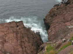 さらに港の出口に行くと、シグナルヒルの対岸下に灯台がある。 ![]() 港の出口。右上がシグナルヒル。 ![]() 港の出口にある灯台。 下の左の写真の頂点がシグナルヒルだ。ちょこっと出っ張っているのが歴史博物館である。下の右(上)の写真は灯台からとった海岸線。セントジョーンズからノバスコシア州のケープブレトン地域にかけては、どこも岩山が急勾配で海岸線に落っこちている地形となっている。