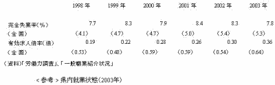 以下は完全失業率及び全有効求人倍率である。2003年時点で沖縄県は完全失業率が7.8%(全国平均は5.3%)、有効求人倍率が0.36%(全国平均は0.64%)となっている。