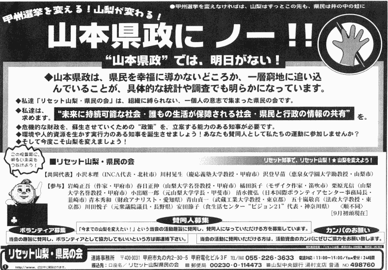 同会は、有識者ら約20人で構成する政治団体。財政面などから「現県政では山梨に明日がない」として、政策立案能力がある新知事を誕生させようと訴えている。知事に求める条件として、政策立案能力のほか、「未来を指し示す哲学」や「透明度の低さの是正」などを挙げている。