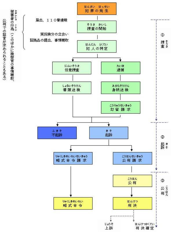 | 【捜査】 捜査は被害者からの通報や告訴、第三者による告発、警察官の職務質問、犯人の自首など様々なきっかけで始まる。 通常、警察が犯人を探し出し、警察から検察に身柄あるいは書類などにより事件が送られ、検察官による事件の終局処理(起訴・不起訴、起訴猶予など)が行われる。これら終局処理前までを捜査という。 本段階では犯人と思われる人のことを被疑者とよぶ。 被疑者には説明を自分がわかる言語でしてもらう権利がある。また、逮捕以後の黙秘権・弁護人依頼権・接見交通権も大事な権利である。 * 犯人が少年(20歳未満)の場合には、手続きに違いがある。 【起訴】 検察官は事件を最終的にどう処理するか決める。これを最終処理という。 最終処理の種類、内容には、@起訴処分、A不起訴処分、B起訴猶予処分、C家庭裁判所送致(少年事件の場合)がある。 起訴処分は公訴の提起とよばれる。 裁判所の審判を求める処分、すなわち裁判を求める処分である。 他方、公判請求される事件、すなわち裁判を求める処分の数倍の事件が略式命令請求される。略式命令請求を、通称、略式起訴と呼んでいる。 捜査を受けながら不起訴処分となることも多い。検察に送られた事件の30−50%が不起訴処分となる。その大部分は起訴猶予処分とされる。 検察によれば起訴猶予とは、起訴する条件は満たしているが諸事情を考慮して起訴しない処分である。 【公判】 公判とは裁判所で行われる審判の手続きを意味する。 公訴が提起されてから裁判が確定するまでの過程が公判手続である。 起訴された時点で被疑者は被告人となる。被告人は通訳や翻訳を受ける権利が法的に保障されている。 また、弁護人を経済的理由などで自分で選べない場合などで通称、国選弁護人の選任が請求となる。国選弁護人とは、被告人が弁護を受ける権利を国家が保証する制度のもとで専任される弁護士を意味する。 ときとして裁判の内容に誤りがあったり、手続きに違法がある場合もある。 そのための是正の手段として日本では3審制がとれる制度がある。上訴は、裁判により不利益をうけた者が、その裁判が確定する前(判決の宣告から14日以内)に不服を申し立てることにより、その変更や取消しを求めるものである。 刑事事件の場合、検察官からも被告人からも可能である。一審を不服として上級裁判所(高等裁判所)に行くことを控訴、二審の内容を不服として上級裁判所(最高裁判所)に行くことを上告という。 ◆詳細解説 1.捜査 @捜査とは 犯罪を起こした犯人を発見し身柄を確保し、証拠を集めて事実を明らかにし、事件を解決するために行う活動を「捜査」という。 捜査には任意の処分による任意捜査と、強制の処分による強制捜査がある。これらは主として警察が行うが検察が行うこともある。 A強制捜査と任意捜査 捜査を進める上で、被疑者の身柄を拘束する場合はもちろん、人の住居に立ち入ったり、所有物を差し押さえたりする場合には、原則として法定の手続により令状の発付を受けて行われなければならない。 これが強制捜査である。 強制捜査以外の捜査を任意捜査と呼ぶ。 これに協力するかどうかは原則として相手方の任意(自由意思によるということ)による。 強制処分は対象となる人の重要な権利や利益に対しての制約や侵害をともなうので、法に定める厳格な要件・手続きにしたがわなければ許されない。 また、刑事事件訴訟法によれば、許される場合であってもできるだけ強制でない処分(任意処分)によるべきだとされている(刑訴法197条1項)。 B任意取調べ 任意捜査のひとつに関係者から事情を聞く「任意取調べ」がある。 被疑者の任意取調べでは、身体の自由をうばわずに取り調べるが、供述拒否権(いわゆる黙秘権が告知される(刑訴法198条2項)。ただし弁解などを任意に供述することは可能。(「被疑者」とは警察が一定の証拠にもとづき犯人であると疑う者のこと)。 C逮捕 「逮捕」とは法律の定める手続きに従い、必要に応じて被疑者の身体を拘束することをいう。 逮捕状が被疑者に示されることが必要で、被疑者が外国人である場合には内容の理解のため翻訳文を一緒に示すことが求められている。 逮捕されて取調べを受ける場合でも黙秘権があることに変わりはない。また、裁判にそなえ自分を守る必要が大きくなるので弁護人を依頼する権利も保障されている。 この弁護人は立会人なく連絡することができる接見交通権が認められている。 D送検 警察は、逮捕してから48時間以内にその身柄を検察に送る。 これを検察への身柄送致(身柄送検)という。 時間内に送致ができない場合は釈放しなければならない(刑訴法203条)。) また、被疑者を逮捕しないで任意捜査を行った場合には、事件の書類を検察に送る。これを検察への書類送致(書類送検)という。 E勾留請求 身柄送検を受けた検察官が、その後も継続して被疑者を拘束する必要があると認める場合には、裁判官に対して24時間以内に勾留の請求を行う(刑