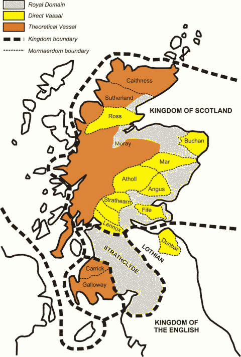 この地方がスコットランドに組み入れられるのは、1018年のマルカム2世の征服によってであった。このころにはオークニー諸島・ケイスネス・サザランドといった北部地域を除き、スコットランド王朝の支配下にあった。北部や島嶼地域は依然ノース人の勢力圏になっていた。 このころ確立されたタニストリーという王位相続制度によって、スコットランドは二つの家系が交互に王位を継承していた。タニストリーは王の生前から後継者を決めてあるため、後継者にしてみれば王の早逝が望ましかった。結果、王の暗殺事件が頻発することになる。戯曲「マクベス」は、こうした社会的背景によって起きた事件の物語である。 アーブロース宣言 ノルマン・コンクエストに始まる外との接触は、スコットランド史に新たな展開をもたらした。ひとつにはイングランドとの勢力争いが顕在化したこと、もうひとつは多様な民族の流入と社会・文化の変化である。 ウィリアム1世らイングランド諸王はノルマン・コンクエストの延長としてスコットランドにたびたび侵攻し、ときにはスコットランドを屈服させることもあった。このころからイングランドとの抗争が日常化し、双方の境界線はハドリアヌス長城を上下した。エドワード1世のスコットランド侵攻とウィリアム・ウォレスの抵抗も、その文脈の中で起こった事件だった。 スコットランドは対イングランド戦略の必要性からフランスと「古い同盟」を結んで対抗した。 その後しばらくフランスとは友好関係を維持するが「古い同盟」はフランスの属国化を意味する体制でもあった。エドワード1世の征服により1296年イングランドに屈服して、王座のシンボルであったスクーンの石を奪われた。しかし、10年後、ウィリアム・ウォレスらが反乱をおこして独立戦争がおこった。この戦争は曲折をへて1318年には実質的独立を達成し、1328年になってイングランドとの和約も成立した。 このとき有力諸侯によって採択され、ロバート1世が承認したアーブロース宣言(1320年)は、マグナ・カルタのごとく、その後のスコットランドの統治の根幹をなす宣言となった。いわく、イングランドに従属する王は人々の手によって斥けられるとする。この宣言はのちのちまでスコットランドの政治を左右し、国王への権力集中を防ぐ効果をもたらした。
