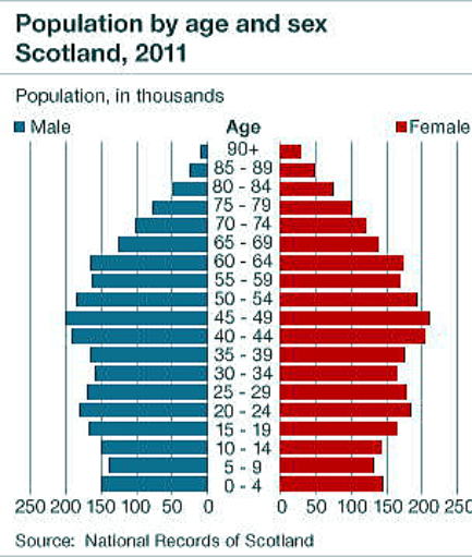 2%ほどの誤差が出た課題としては、(1)もととなる人口データが2011年度のものであること、(2)年齢毎ではなく10から20年ごとの数値であること、(3)投票した住民の年代別数(割合)が不明であること、などによる誤差があります。しかし、それなりに参考になる数字だと思います。 今後、最新の人口データ及び年別得票数などのデータを入手することで、より精度の高い解析をしたいと考えております。 とはいえ、今回のスコットランド独立住民投票結果は、 ほぼ以下の2つの高齢者の年齢階層が反対したことと、その年齢階層の女性の割合が多いこと、とくに65歳以上で、それが顕著なことが主たる原因であることが分かったと言えます。 55〜64歳:賛成43、反対57 65歳以上:賛成27、反対73 なお、以下はスコットランド政府が公表している2011年の年代別の人口と人口割合です。このデータには男女別の人口と人口が無かったので、上記の解析には使用していません。 表3 スコットランド政府が公表している2011年の年代別の人口と人口割合 (ただし、男女別データなし)