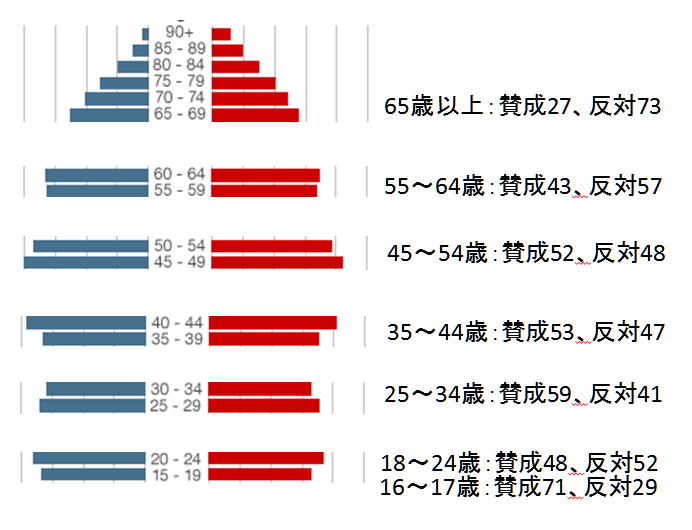スコットランド独立住民投票の年代別の賛成、反対割合が分かりました。以下の通りです。全体結果 賛成 44.65%、反対 55.25%、最終投票率は、84.59%です。 表1 スコットランド独立住民投票の年代別の賛成、反対割合 16〜17歳:賛成71、反対29 18〜24歳:賛成48、反対52 25〜34歳:賛成59、反対41 35〜44歳:賛成53、反対47 45〜54歳:賛成52、反対48 55〜64歳:賛成43、反対57 65歳以上:賛成27、反対73 データ:、イギリス保守党副幹事長を務めたマイケル・アッシュクロフト卿 (上院議員)。イングランド側からのデータです。 出典 Scottish Referendum Poll CATI & ONLINE Fieldwork : 18th-19th September 2014 上記表1 の割合を年齢別人口比で加重平均して見ると、65歳以上の反対が著しく多く、55歳以上も反対が多いことが分かります。逆に16歳から54歳は、ホトンドが賛成が多くなっています。 下の図1は2011年度のスコットランドの人口構成です。日本ほどではありませんが、高齢化が見て取れます。 ![]() 図1 スコットランドの年代別の人口数 註)有権者の人口構成(ただし、有権者は16歳以上) 以下の図2は、上の人口構成図のうち、有権者を抜き出したものです。ただし、有権者は16歳以上なので、実際は15歳は含まれません。 ![]() 図2 スコットランドの有権者の年代別の人口数 註)有権者の人口構成(ただし、有権者は16歳以上) さらに以下の図3では、上の図を年齢階層毎に切り分け、年代別の賛成、反対割合と対比してみました。 ![]() 図3 スコットランドの有権者の年代別の人口数と賛否割合 註)有権者の人口構成(ただし、有権者は16歳以上) ◆解析結果 上記をもとに賛成、反対の加重平均を割り間で出してみると、表2にあるように46.8 vs 53.2 となり実際の数値より賛成の割合が多くなっています。 なお、上記では、18〜24歳は15〜19のうち5分の2と20〜24を足しています。また、16〜17は15〜19のうち5分の2としています。 表2 解析結果