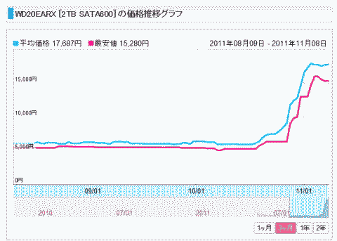 Core i5 2500Kを使った超高速、超大容量パソコンの自作の部品を検討している最中、とんでもないことが起きた。 なんと、主要な部品である内臓ハードディスクが一気に3倍以上、値段が跳ね上がったのだ。以下は、価格コムに見る高騰のデータである。いずれもメーカーを問わずハードディスク3倍以上に高騰していることが分かる。 下はWD20EARX [2TB SATA600] の価格推移グラフである。もともと、6000円台だった内臓3.5インチハードディスクがなんと16000円台まで高騰しているではないか! http://kakaku.com/item/K0000256713/pricehistory/ ![]() 他の製品でもほぼ同様に3倍以上値上がりしている。 http://kakaku.com/item/K0000239107/pricehistory/ http://kakaku.com/item/K0000183490/pricehistory/ 何ともびっくりだが、下はタイにあるWestern Digital者が大洪水で浸水している写真である。 ![]()