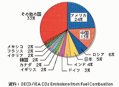 1990年の排出量に対比すると実にプラス13%近く増加したことになり、EUなど目標をすでに達成している国に顔向けできない常態にある。 日本政府はこれまで<京都メカニズム>と言って、@吸収源、A排出権取引、B共同実施、CCDM(クリーン開発メカニズム)といった、いわばつじつま合わせ政策づくりに奔走してきたといえる。その背景にあるのは、国、とくに旧通産省、現在の経済産業省が産業界、とくに鉄鋼、電力など大量の二酸化炭素を排出する産業に必要以上に気遣ってきたことがある。 一説には議長国としてマイナス6%を日本は目標としたが、経済産業省幹部は当時の経団連や基幹産業の幹部に、ことのはじめから削減は業界の努力目標であって、義務ではなく、「規制的な対策はとらない」という趣旨の裏約束をしていたという。 もともと環境庁のちの環境省は、日本の環境政策立案で主導的な立場にない。環境影響評価法制定をみるまでもなく、たえず通産省、のちの経済産業省が裏で経済産業界と取引を行い、環境省の動きを牽制し、蹂躙してきたと言える。 .... 今回の洞爺湖サミットでは、二酸化炭素排出の削減目標の設定割合と目標設定が大きな課題となっている。西暦2050年に世界中の二酸化炭素排出量を半分に削減することが、すでに安倍政権時代提案されているが、これには課題はいくつかある。 まず図1を見てもらえれば分かるように、日本を例とした場合、1990年から2008年まで13%も二酸化炭素排出量が増加しているのに、2050年に1990年対比でマイナス50%削減が可能かどうかということである。2050年と言えば、首相、政治家はじめ現在の政策担当者はいなくなっている。できもしないことを先のことは誰も分からないとばかり、長期目標としていないか? という大きな、本質的な課題がある。 ![]() 図1 地球温暖化対策のための長期目標の設定 具体的な課題としては、二酸化炭素排出量の半減という場合、西暦何年を基準年とするかである。京都会議のとき対比すべき基準年は1990年とされたが、今回の長期目標では1990年なのか?それとも2012年なのか?が問われる。この基準年問題は、未だ各国の間で合意は得られておらず、うやむやとなっている。 次の課題は、仮に1990年を基準年とし2050年を目標年次とした場合、たとえば、2015年、2020年、2025年、2030年、2035年、2040年、2045年などに各国がどれだけ目標に向かっているかを監視あるいは進捗管理を実施するための中間目標年(削減目標値)を設定するかどうかである。 1997年から2008年の間にマイナス6%の宿題を達成できず、あれこれ言い訳をしたり、姑息な手段、すなわち京都メカニズムでお茶を濁そうとしている日本政府がいくら2050年に50%削減といってもEU諸国や新興国、発展途上国は誰も信用しないだろう。 3番目の大きな課題は、いうまでもない世界で排出されている二酸化炭素の1/4を一国で排出している米国は、2001年にブッシュ大統領が京都議定書から離脱を表明した。この傲慢、勝手な米国をどう復帰させるか?がある。 図2は2000年における中国、インドを含む世界各国の二酸化炭素排出割合データである。出典はOECD/IEAである。 ![]() 図2 2000年における国別の二酸化炭素排出量割合 米国は一国で世界全体の1/4を排出している! 図2は、図3に示す世界の国に別石油消費割合に符合している。世界人口のわずか4%の米国が、世界全体の石油の25%以上を消費している現実がある。 ![]() 図3 世界の国別石油消費消費割合 単位% 世界の人口のわずか4%の米国が世界のエネルギーの 1/4近くを一国で消費している。 ブッシュ大統領は、中国、インドなど人口が多く経済成長が著しい新興国の参加がなければいくらその他の国が目標を設定をしても意味がないという主旨のことを言い続けている。 図2を見ると、確かに中国とインドからの排出量は17%もある。しかもBRICS諸国は今後、今まで以上に経済成長を達成するであろうから、米国の言い分にも一理はある。しかし、本来、一国で世界の1/4近くを排出する米国こそ、削減のためのリーダーシップを発揮すべきである。しかし、現状はいわばガキ大将が言いたい放題いって開き直っている。これにどう対応するか?が問われる。 日本は今までもそうだったように、今後も死に体のブッシュ大統領が洞爺湖サミットで中国、インドなどの新興国問題について言及した途端、それにまともに反論できないと思える。それは単に米国追随というだけでなく、京都会議の議長国として何らマイナス6%の宿題を果たしていないからである。 その日本政府は、今回の洞爺湖サミットでも、セクター別削減量積み上げ方式を提案しているが、これも産業セクターをさらに鉄鋼、電力、セメントなどに細分化し、各セクターにおいて日本の高エネルギー効率技術を諸外国に移転すれば、二酸化炭素は大幅に削減できるというものだ。 だが、マイナス6%という目標をまったく達成していない日本がセクター別削減や京都メカニズムなどの方法に固執すれば、各