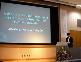 発表するLiang ZHANG武漢大学教授。タイトルは「A Decentralized Land Treatment System for the Treatment of Rural Wastewater」