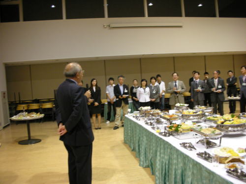 セッションC終了後、大学のカフェテラスで午後6時過ぎより「歓迎パーティ」が行われ、北海道の室蘭大学に出張していた中村英夫学長が駆けつけ、武漢から来られた方々等に挨拶を行った後、参加社で懇談した。