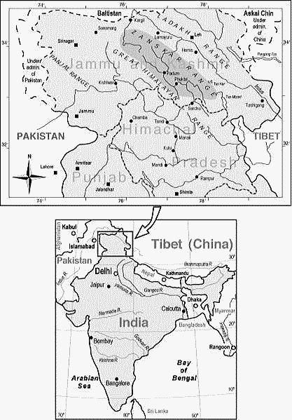 ◆ザンスカール(カシミールの一部、インド) ![]() ヒマラヤ山岳の国と地域 Source:Wikipedia をもとに青山作成 ![]() ザンスカールの地形 出典:グーグルマップ <概要> ザンスカール (Zanskar) は、カルギル地方(インド北西部のジャンムー・カシミール州の一部)にある高地の地名である。位置は以下の地図を参照のこと。ザンスカールは、一部カシミール及びラダックとオーバーラップしている。 ![]() ザンサカールの位置 出典:Wikimedia Commons チベット民族が住み、広義のラダックの一地方とも見なされる。ラダック王国に服属していたが、19世紀に同王国とともにカシミール王国へ併合された。 また古くはグゲ王国 (Guge) や吐蕃王国の版図に属していた。ザンスカールはチベット語で「白い銅」を意味し、銅の産地として知られていたことに由来する。 チベット文字では (zangs dkar) と書き、ラダック語(英語版)ではザンスカール、標準チベット語(ラサ方言)ではサンカルと読む。ザンスカール当地の方言でもザンカルに近い。パドゥム(英語版) (dpa' gtum: Padum) がこの地方の中心都市である。 <歴史> 10世紀頃から、ザンスカールは2つないし4つの血族関係のある諸侯によって構成されていた。このころ、カルシャ僧院(英語版)(Karsha)とプクタル僧院(英語版)(Phugtal)が建設された。 15世紀以降はラダック王国(英語版)の属領として服属し、そのあとの運命を幸不幸ともに共有することになる。1822年、クルとラホール、キンナウルの連合がザンスカールを侵略し、パドゥム王宮を破壊する。1842年、ラダック王国はインドのジャンムー・カシミール藩王国(英語版)(1846年 - 1947年)の一部として併合される。 カシミール紛争によってラダック王国の旧領土はパキスタンと中国に分割されたが、ザンスカール地方はラダック中央部とともにインド支配地域となっている。 ![]() カシミール地域とラダック 小豆色部分がラダック地方 出典:Wikimedia Commons