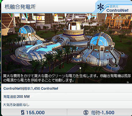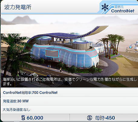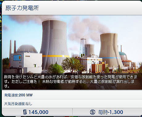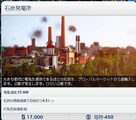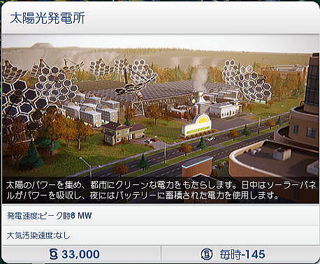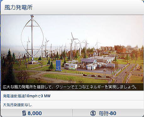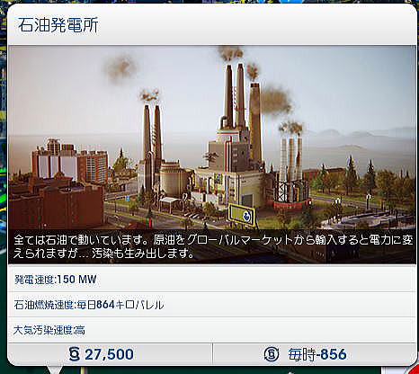 ◆シムシティにおける発電システムのオプション 次に各発電方式ごとにそのオプションについて一つ一つを見てみよう。オプションとは、たとえば風力発電の場合、初期投資をして建設した後に出力を増やしたい場合、一から初期投資することなく、オプションでタービンやモジュールを廉価に追加できることを指している。 したがって、このオプションを使うことにより土地面積、建設コストともに大幅に節減することができる。ただし、必要となる土地面積は、それぞれの発電方式でまったく異なり、最後は実際にオプションのタービンやモジュールを実際に土地の上に置いて決めることになる。これが意外と微妙であった。 ○風力発電 風力発電は、現在、世界中で利用されている主要な再生可能エネルギー源と言ってよいだろう。ドイツ、デンマーク、スウェーデン、スコットランド、イングランド、カリフォルニア州、中国など、世界各地に設置されており、日本でも5月中旬に出かけた青森県だけでも200基もの風力発電が設置されている。 標準の風力発電は10mphで1時間当たりのピーク電力が3MWとなっている。日本各地で使われている風力発電は概ね1時間当たり1MW〜3MWなので、ほぼその規模と考えて良いだろう。 ![]() 風力発電のオプション(追加)には、設置するための砂利道、看板、それに標準規模(3MW)の風力タービン、5.1MWの風力タービン、さらに15MWの垂直タービンなどがある。 当初は建設費、維持管理費がそれなりに高額であるが、オプションでタービンを増やすことにより、MW当たりの単価はかなりの割引となる。したがって、オプションをうまく使ことが再生可能エネルギー利用の大きなポイントとなる。また風力発電のオプションでは大きな直径を持つ風力発電タービンや垂直翼をもつタービンがある。土地面積を必要とするが、場合によっては3MWのものを多数設置するよりはるかに効率的となることがある。 ![]() ○石炭火力発電 ここでは、化石燃料系の発電は使用しないが、標準の石炭火力発電所は、17000シムミリオンで、1時間当たり75MWの発電能力を持っている。単純に比較すれば1台で標準の風力発電の25倍の発電能力を持つことになる。 ![]() 石炭火力発電にもオプションがある。標準のもの、汚染が少ないもの、さらに汚染がすくないものだが、いずれも出力は1時間当たり75MWである。化石燃料系の発電システムの問題は、いうまでもなく燃料価格の上昇とともに、大気汚染である。 実際のシムシティでは、石炭火力の立地に際しては、年間通じて卓越する風向が示されるので、風上に住宅地がないように立地を選定することになる。これを間違えると、膨大な費用があとから町全体にかかることになる。 実際にやってみて大気汚染問題はきわめて重要なものであることが分かった。大気汚染により市民が呼吸器疾患などの病気となると、診療所や病院を増やさなければならなくなる。さらにベッド数が足りなくなると、病棟を増設しなければならなくなり、全体として財政を圧迫することになる。これは石炭火力だけでなく、石油火力でも同じである。 オプションでは同じ出力でありながら汚染が少なくなっている。ただし、それに応じて建設コスト、維持管理費が高くなる。 ![]() ○石油火力 ここでは、化石燃料系の発電は使用しないが、標準の石油火力発電所は、27500シムミリオンで、1時間当たり150MWの発電能力を持っている。単純に比較すれば1台で標準の風力発電の50倍の発電能力を持つことになる。 ![]() 石油火力発電にもオプションがある。標準のもの、汚染が少ないもの、さらに汚染がすくないものだが、いずれも出力は1時間当たり75MWである。 実際のシムシティでは、石油火力の立地に際しては、年間通じて卓越する風向が示されるので、風上に住宅地がないように立地を選定することになる。これを間違えると、膨大な費用があとから町全体にかかることになる。 ![]() ○メガソーラー発電 メガソーラー(大規模太陽光発電)では、標準の風力発電がピークで8MWとなっている。風力の3倍弱だが、建設コストが4倍強となっている。 ![]() 太陽光発電のオプション(追加)には、標準規模(8MW)のメガソーラーより大きな12.1MWがある。さらにピークで37.5MWの濃縮太陽電池がある。これは日中の余剰電力を蓄電するためのバッテリーである。 ![]() ○原子力発電 ここでは説明を省くが原発もある。 規模は200MWである。シムシティ開発の本場米国ではスリーマイルズ島事故があった。またチェルノブイリ事故さらに2011年の福島第一原発事故が起きていること、さらに初期投資、維持管理費が高額なことから、メニューにはあるものの推奨されていない感じがある。とくにシムシティ2013は人口規模が少ないまちを想定していることもあり、原子力発電の設置は物理的にも困難である。地域全体がPAZ内に入ってしまうこととなる。 なお、個別自治体とは別に複数の自治体が連携し起こすビッグ・プロジェクト(偉業とい