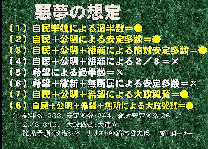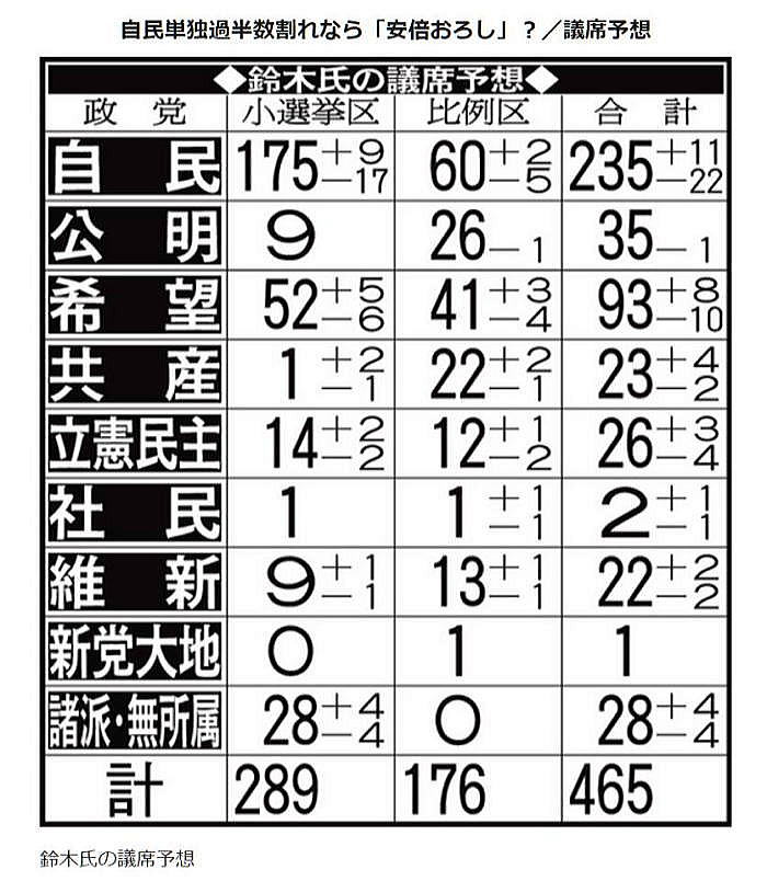下の想定は政治ジャーナリストの鈴木哲夫氏の議席予測をもとにした<悪夢の想定>です。 , 最大の悪夢は大連立による大政翼賛体制です。民進が右保守とリベラルに分かれた結果、憲法改正などで大政翼賛が十分に考えられることになります。 , 自民党は減っても公明と合わせ、安定多数、また自民+公明+維新で絶対安定多数となる可能性があり、安倍晋三氏が再度首相になる可能性は大です。 , 希望の党は、東京など大都市を中心にかなり失速しており、維新、無所属を合わせても単独過半数はありえないと推察されます。もっぱら、希望のメンツを見るに、政権を担うだけのスタッフはなく、これも悪夢と言えます。 , ![]() 以下は、上記想定のベースとした鈴木哲夫氏の議席獲得予想です。 ![]() 出典:日刊スポーツ |
