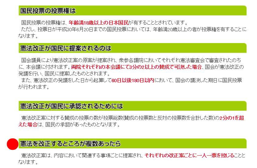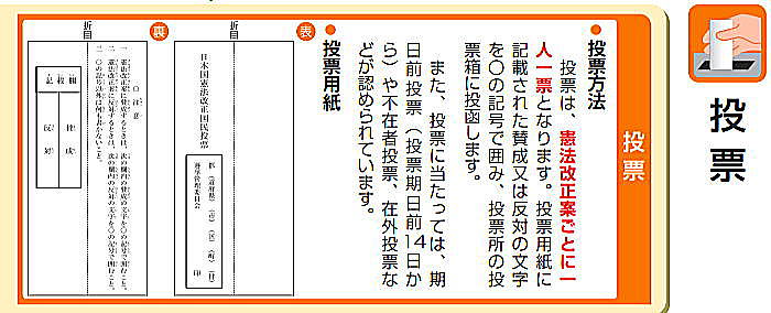 @手続の概要 A一度あった原案提出 B改正案の落とし穴 C同床異夢の2/3 D世論調査の行方 E脱原発条項を! F改憲・立憲トピックス ◆憲法改正の発議 憲法改正原案について国会における最後の可決をもって、国会は憲法改正の発議をし、国民に提案したものとされる。 発議の内容は、関連する事項ごとに区分して発議されることになる、とあるので、自民党が過去何度か出している改正草案のように、たとえば主権を国民から国家とするような事項は、憲法前文だけでなく全項目の変更に関わるものであるので、条項の一部を変更、追加、削除するものではなくなる。 すなわち、従来からの自民党自主憲法草案のように、現行憲法とは別に自主憲法を提案するような改正草案は、条項ごとの変更、修正、削除、追加ではすまなく、自民党の憲法改正原案を自主憲法案とすることになるので、発議の内容は、関連する事項ごとに区分して発議されることとは異なる、あるいは反するものとなるはずである。 しかし、以下に述べるように、一括投票案による投票のように、個別条項の改正などではなく、改正草案のように多数の条項案を一括して国民投票にかける方式もないとはいえないのである。 ◆国民投票時に憲法改正案が複数ある場合 ステップ4の国民投票では、憲法改正案ごとに一人一票となる。 これは、国会における2/3以上の議員をもって行われる憲法改正案の発議が、内容において関連する事項ごとに区分して行われるためである。 下の図は、投票用紙のイメージである。 ![]() 出典:選挙ドットコム 下図の最下段にあるように、国民投票で、もし、憲法改正案が複数ある場合は上記の投票用紙は、憲法改正案ごとに調製されることになる。 ![]() 国民投票では、当然のことだが、憲法第九条改正に賛成か反対の投票だけではない。 , 投票の具体的な流れとしては、個別の憲法改正案ごとに投票用紙を受け取り、記入し、投票箱に投函し、次の憲法改正案の投票に移るという方法が想定される。案の数だけこれが繰り返されることになる。 逆説すれば、実際の投票では、「憲法改正」そのものの是非ではなく、個別の改正項目毎に投票者の1/2が得られるかが問われることになるのである。もちろん、国民によっては、A案には賛成だがB案には反対という投票者もあるし、改正そのものに反対の投票者は、すべての投票用紙に反対を投ずることになる。 国会議員が衆参それぞれでで2/3以上で憲法改正が発議されても、肝心な国民投票では、個別の改正項目毎に有権者に判断されることとなるのである。国会法68条の3では『個別発議の原則』において個別発議の案が複数あった場合に相当する。 ◆一括投票か、条項ごとの個別投票か ところで、憲法改正案でもっとも重要なことは、国民に賛否を問う案そのものの形である。 ここにいう形とは、大別して2つある。それは条項ごとの個別投票か、がこれに該当する。それとも条文を一括して投票にかけるのかである。具体例を示せば、以下のようになる。 具体案を示せば、条項ごとの個別投票の例としては、憲法改正案が安倍首相が2017年5月3日「日本会議」の集会にビデオメッセージを送ったように、憲法九条の第一項、第二項に加え、第三項として自衛隊の存在を書き加えるような場合と、もうひとつの条文を一括して投票する例としては、自民党憲法改正草案のように、現行憲法の内容を丸ごと代える単独の条文の場合である。 一括投票の条文の場合には、複数ある条文間に矛盾が生じない様、まとめて発議されることになるから、このような場合には条文全体を対象に、国民は賛成、反対の投票を行うこととなる。もちろん、個別条文の改正の場合でも、項目の間での矛盾が生じないようにすることになる。これらは、憲法審査会において審査されることとなる。 すなわち、 憲法改正案が複数の関連する条文がまとめて発議されている場合は、複数の条文をまとめて一人一票で投票することになり、単独の条文として発議されている場合は、その条文のみに対して投票する事になるわけである。 上記はについては、国民情報/住民投票情報室の今井一氏のコメントを以下に示す。 投票形式をめぐっては、@複数の条項を一まとめにして賛否を示す一括投票になるのか、A各条項ごとに賛否の意思を示す個別投票になるのか、という問題があります。しかし、他国の事例を見る限り、相互に全く関係のない問題を並べて回答は一つということはあり得ません。個別投票は世界の常識です。 とはいえ、日本でこの先、憲法改正の国民投票が行われた場合、それが完全に個別投票になるかどうかについては、まだ曖昧な部分も残っています。 一つは自民党内の手段を選ばない人々の思惑です。私は3年半ほど前、自民党所属のある国会議員と討論会に出席した際、憲法改正手続法では条項ごとの個別投票になるかどうか問い質したことがあります。彼の答えは「それは何とも言えない」というもの