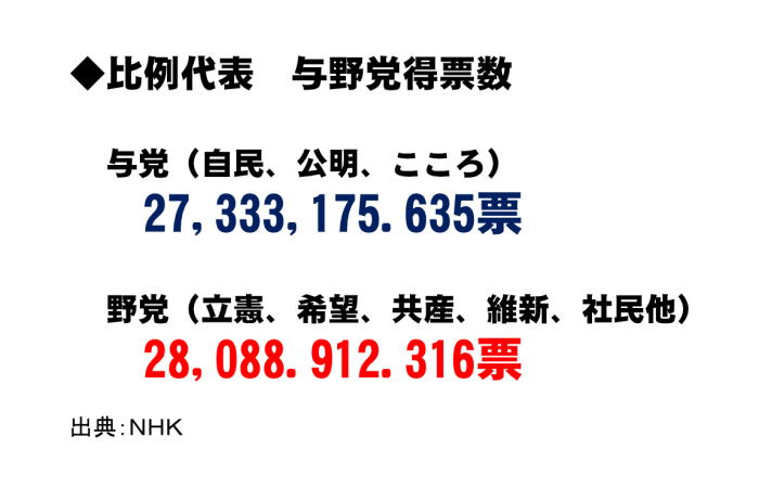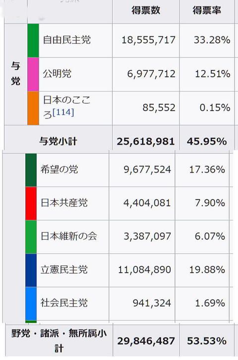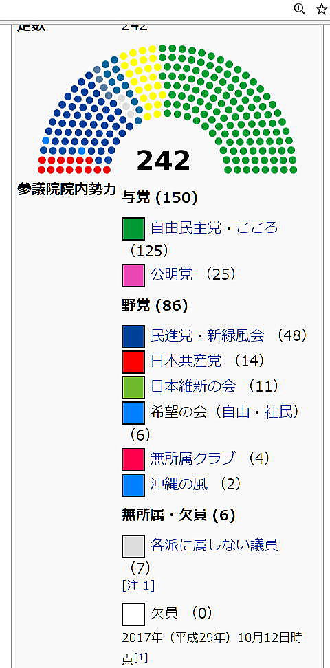 @手続の概要 A一度あった原案提出 B改正案の落とし穴 C同床異夢の2/3 D世論調査の行方 E脱原発条項を! F改憲・立憲トピックス ◆現在の党派別議席数の現状 衆議院では、310議席が憲法改正発議議員数である全体の2/3となるが、今回の第48回衆議院銀選挙の結果は自民党(284)+公明党(29)=313議席と両党だけで310議席を超えてしまったのである。 以下の図はそれを示している。 ![]() 出典:Wikipedia ![]() 出典:Wikipedia では、参議院はどうか? 参議院では与党は議席数で2/3を超えていない。しかし、自民党(125)+公明党(25)に日本維新の会(11)が加わると、参議院でも2/3(=161)に到達することになる。 ![]() 出典:Wikipedia ◆同床異夢の衆参両院議員で2/3以上 次のステップで憲法改正案を国会で採決するためには、両院それぞれの本会議においてそれぞれの総議席の 3分の2以上の賛成が必要である。 , では、現状で本当に衆議院、参議院の採決で2/3以上が可能かどうかについて検討してみたい。 , (1)衆議院では今回の選挙で2/3を超えたが、与党の自公のうち、公明党が憲法改正に難色を示していると言われている。 今回の衆議院選挙で公明党が大幅に議席を減らしている。公明党の当選議席は小選挙区と比例代表で29人だが、改選前に比べると6人も減らしている。 その理由として考えられるのは、創価学会の会員、公明党の党員の多く、とくに女性会員や党員が憲法改正に反対しており、選挙で棄権や他党に投票したのではないかと思われることだ。 (2)事実、公明党の山口代表は、ことあるたびに公明党は憲法改正に慎重に対応することを明言している。その結果、今回当選した29人(議席)全員が2/3採決に賛成するかどうかは分からない。今後次第で相当数の反対がでる可能性がある。 もちろん、これは憲法改正内容、形態にも関連している。国民主権を国家主権に変えるような自民党憲法改正草案のような案には、公明党議員は全面的に反対するだろう。しかし、安倍首相が提案した第九条に第三項を加えるような場合には、賛成する可能性もあるかもしれない。 (3)また憲法改正に前向きな維新はどうかと言えば、やはり今回の選挙で大幅に議席を減らした(選挙前議席から3人減らして11人となっている)。この減少は公明党の場合とは理由がことなるだろうが、公明党の減少を維新で補うことが必ずしも可能とはならない。 (4)このことは大量議席を有する自民党についても言える。自民党は表むき憲法改正を前提として結党した政党であるが、いざとなったら反対、棄権する議員がでないとは言えない。とくに安倍政権下での改正に危険を感じているハト派議員がそれに妥当する。 (5)次に建前は野党となっている「希望の党」だが、小池氏が個々の候補者との間で協定書を交わしている。その中に憲法改正がある。小池氏は結党理念からして、「希望の党」の議員に採決時賛成するよう指示する可能性がある。 (6)「希望の党」の議員のうち、後から合流した民進党の議員のおそらく半分((25人)が2/3採決に賛成する可能性がないとはいえない。 (7)日本維新の党も公明党同様、今回の衆院選挙で大幅に議席を減らしたが、2/3採決には全員が賛成するであろう。 (8)参議院で与党は議席数で維新を加え2/3となるが、 自民と公明だけでは、自民党(125)+公明党(25)=150で到底2/3(=161)には届かない。維新を加えると調度2/3となる。 (9) 今後の参議院議員選挙で自公で、また維新を加えて161議席以上とれるかどうかはわからないが、衆院で分裂した民進党が参院でも分裂要素があるため、過半数を超える可能性もある。 (9)しかし、衆院同様、参議院公明党議員が憲法改正に棄権や反対したり、同様に参議院自民党が棄権や反対する可能性は否定できない。そのために、自民党は安倍提案に象徴されるように、公明党でも賛成できるよう、自民党改憲草案のような一括案ではなく、個別案を用意する可能性が高い。 以下に直近の衆院選挙における比例代表得票結果を示す。 ◆直近の衆院選挙の比例代表得票結果 国民投票を考えるうえでの重要データとして、今回の選挙の比例代表投票結果がある。今回も、与党系と野党系の数は拮抗しているからである。 以下はそれを示している。 総得票数では、過去から今回まで野党系に投票した有権者の方が多い。しかし、ここでも、「希望の党」や「日本維新の会」に投票した有権者がおり、国民投票において賛成に回る可能性がある。 ![]() ![]() 出典:Wikipedia , ただ、後で示す世論調査結果からもわかることだが、国政選挙で与党に投票した有権者が憲法改正に賛成であるとは限らない。おそらく自民党に投票した有権者でも憲法改正に反対、棄権がいるだろうし、公明党支持者はそれ以上に憲法改正に反対の可能性がある。 つまり、仮に、衆参それぞれの院で2/3の発議が可能になっても、実際の憲法改正の国民投票で過半数が賛成するか分からないのである。