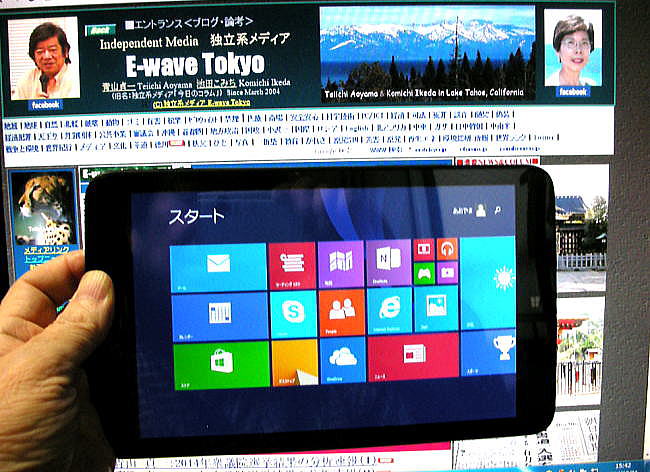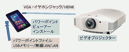 ![]() ドスパラのDiginnos DG-D08IWB ![]() Windows 8.1 チュートリアル 何と言っても、注目すべきはその重量です。わずか350g程度しかありません。 下はドスパラのタブレットのWindows8.1を起動させたところです。背後に写っているのは、19インチスクエアーのパソコンの液晶画面です。 ![]() ドスパラのタブレットのWindows8.1を起動させたところです。 撮影:青山貞一 Nikon Coolpix S8 ではどうやってこのタブレットを上述の目的のために使うかというと、以下のようになります。 このタブレットはれっきとした最新のWindowsマシンなので、マイクロソフトのOfficeをインストールできます。しかし、私の場合、このタブレット上でパワーポイントをつくることはありません。あらかじめ自宅のデスクトップPCでつくったパワーポイントを国内外に持参し、講義、講演するのが主です。 そこで、タブレットのSSDにマイクロソフトのパワーポイントビューアー(約65MB)をインストールしておき、SSDかマイクロSDをVHD(一種のハードディスク)にパワーポイントを入れ、タブレット上でパワーポイントを稼働させています。VHDの初期設定は、少々面倒ですが,一度設定すれば後は外付けHDDのように使えます。 パワーポイントビューアーのダウンロード例 もちろん、パワーポイントには動画も入れており、音声も入っています。 タブレットからビデオプロジェクターやアンプへの出力は、どうでしょうか? プロジェクター側にHDMI端子がある場合は、タブレットのマイクロHDMIから変換コネクタを経由してHDMIに入力します。またHDMIがない場合は、タブレットのマイクロDHMI端子からVGAへの変換コネクタを経由して投影します。以下に変換コネクタの例を示します。いずれも数100円です。 ![]() マイクロUSB→USB マイクロHDMI→VGA VGAの場合は、音声が含まれないのでイヤホンジャックからスピーカーアンプに音声を流します。以下の図を参照ください。 ![]() 出典:青山貞一 いずれの変換コネクタも数10gと軽いものばかりなので、全体としての重量も400gにもなりません。