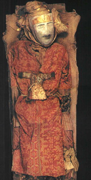 | 総合メニュー(西域) 新疆ウイグル自治区博物館 博物館(百度百科1) 博物館(百度百科2) 博物館(百度百科3) 博物館(百度百科4) 博物館(百度百科5) 博物館(百度百科6) 博物館(百度百科7) 博物館(百度百科8) 本稿の解説文は、現地調査や現地入手資料、パンフなどに基づく解説に加え、百度百科中国版から日本への翻訳、Wikipedia 日本語版を使用しています。また写真は現地撮影以外に百度百科、Wikimedlia Commons、トリップアドバイザーさらに地図はグーグルマップ、グーグルストリートビュー、百度地図などを使用しています。その他の引用に際しては、その都度引用名を記しています 次は、新疆ウイグル自治区のウルムチ市にある新疆ウイグル自治区博物館の百度百科6す。 ◆新疆ウイグル自治区博物館6: 兵営(营盘)の男性ミイラ 1995年、新疆考古遺産は、新疆ロプノール県の兵営(营盘)遺跡のひとつは、漢・晋時代の埋葬墓であり第15埋葬坑から男性のミイラが発掘されました。古代のミイラが来ている服装は今なお服飾は鮮やかで豪華です。特に「赤地の布に人と獣と樹木の模様を描いた外套(红地对人兽树纹罽袍)」は非常に珍しいものです。 死亡年齢はおよそ25歳、男性、身長は1メートル8cmです。このミイラは、1997年に、全国でもトップ10に含まれるほど希少な考古学的発見のひとつであると評価されました。 ![]() 出典:中国考古 Xiaohe墓地の女性の死体(ミイラ): ![]() 出典:中国百度百科 小河墓遺跡の女性のミイラ: 女性のミイラの身長は158cm、皮膚は灰白色(ベージュ色)、胸の乳房は明らかに垂れ下がっています。頭と顔の部分の保存状態は極めて良好で、額は狭く、目は深く落ちくぼみ、まつげが僅かに見られ、鼻は細く小さく、唇はしっかり閉じています。ベージュ色(薄茶色)の髪は自然に中央で分けられ、首から肩までの長さがあります。髪の毛の表面には糊のような物が塗りつけられており、紐で縛って一つにまとめられています。彼女が3800年前に活きていたとは到底見えま せん。 そして最後に男女のミイラ: 皮膚の保存状態はよく、毛髪もすべて残っています。彼らの顔は二人とも美しく化粧されています。また、彼らは濃い茶色の長いコートを身につけています。コートの裂地はウールの平織で、足には長いブーツと、色つきのフェルトの靴下を履いています。こうした発見は、新疆には、2800年前に、当時新しい畜産加工製品のひとつであったフェルト工芸が存在していたことを証明しています。 ![]() 出典:中国百度百科 博物館(百度百科7) へつづく |