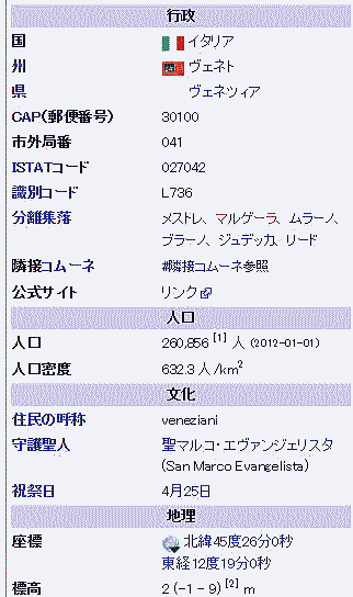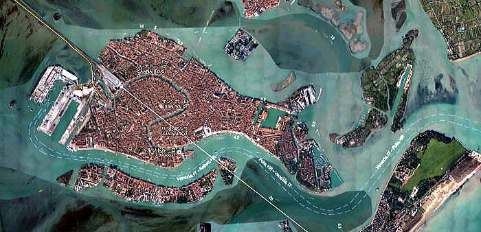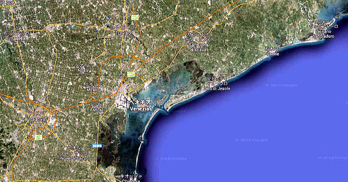 | <ヴェネツィア総合メニュー> ヴェネツィア1 ヴェネツィア2 ヴェネツィア3 ヴェネツィア4 ヴェネツィア5 本稿の解説文は、現地調査に基づく開設に加え、Veneziaイタリア語版を中心にVenice英語版からの翻訳及び日本語版を使用しています。また写真は現地撮影分以外にWikimedlia Commons、さらに地図はグーグルマップ、グーグルストリートビューを使用しています。その他の引用に際しては、その都度引用名をつけています。 ◆はじめに2(Venezia、イタリア、Venice) 列車はリベルタ橋を渡りヴェネツィア本島にあるサンタルチア駅に到着。サンタルチア駅の駅前は下の写真のように広場があり、そのすぐ前は大運河(カナル・グランデ)に面しています。 ![]() サンタルチア駅前の大運河(カナル・グランデ) 撮影:青山貞一 Nikon Coolpix S8 2006年3月 私たちはすぐに水上バスのチケットを購入し、まずは海上からサンマルコ広場、サンマルコ寺院など視察するとともに、ベネディクト会のサン・ジョルジョ・マッジョーレ教会がある島に立ち寄ったあと、本島をくまなく視察しました。 以下は 「シルクロードの今を往く」におけるトルコのイスタンブールからヴェネツィアへのルートと徒歩の場合の所要時間です。 ![]() ヴェネツィア(イタリア)の位置 出典:グーグルアース ![]() ヴェネツィア(イタリア)の位置 出典:グーグルアース 下は ヴェネツィア本島です。左上から島に入っている線が鉄道と道路が走るリベルタ橋です。本島の中を逆S字で流れる運河は、カナル・グランデと言います。本稿では「大運河」としています。 ![]() ヴェネツィアの位置 出典:グーグルアース まずはヴェネツィアの概要について紹介します。 参考・出典はイタリア語、英語、日本語のWikipediaです。 ◆ヴェネツィア( Venezia、イタリア) ![]() 出典:Wikipedia 概要 ヴェネツィア(イタリア語: Venezia、英語:Venice)は、イタリア共和国北東部に位置する都市で、その周辺地域を含む人口約26万人の基礎自治体(コムーネ)を指します。ヴェネト州の州都、ヴェネツィア県の県都です。ベネチア、ベニスなどとも表記されています。 ヴェネツィアは中世にはヴェネツィア共和国の首都として栄えた都市で、「アドリア海の女王」「水の都」「アドリア海の真珠」などの別名をもちます。 英語では「Venice」と呼ばれ、これに由来し日本語でもヴェニス、ベニスと呼ばれることもあります。 古来ヴェネツィアは、ラテン語でウェネティ人の土地を意味し、ウェネティ人が住んでいたアドリア海の奥に広がる土地をウェネティア (Venetia) と呼んだことからVeneziaは来ています。 地理・領土の変遷 都市としてのヴェネツィアは、ヴェネタ潟上の島(ヴェネツィア本島、5.17km2)に築かれています。 自治体(コムーネ)としてのヴェネツィア市(Comune di Venezia)は、ヴェネタ潟の島々や、メストレなどの本土側も市域に含んでおり、面積は412.54 km2 に及んでいます。 市域に含まれる島として、本島のすぐ南には「サン・ジョルジョ・マッジョーレ島」「ジュデッカ島」、さらに南に下ると映画『ベニスに死す』で有名な「リード島」があります。 また、本島のすぐ北には、墓地となっている「サン・ミケーレ島」、さらに北にはヴェネツィアン・グラスで有名な「ムラーノ島」、レース編み産業の地「ブラーノ島」、そしてもっとも古い時代に栄えた「トルチェッロ島」があります。 ![]() ヴェネツィア県におけるコムーネの領域 Source:Wikimedia Commons パブリック・ドメイン, リンクによる ![]() ヴェネタ潟内の島々の位置関係 Source:Wikimedia Commons CC 表示-継承 3.0, リンクによる ヴェネツィアに隣接するコムーネ(中小自治体) 隣接するコムーネは以下の通りです。 ・カンパーニャ・ルーピア ・カヴァッリーノ=トレポルティ ・キオッジャ ・イェーゾロ ・マルコーン ・マルテッラーゴ ・ミーラ ・モリアーノ・ヴェーネト (TV) ・ムジーレ・ディ・ピアーヴェ ・クアルト・ダルティーノ ・スコルツェ ・スピネーア ヴェネツィア3へつづく |
