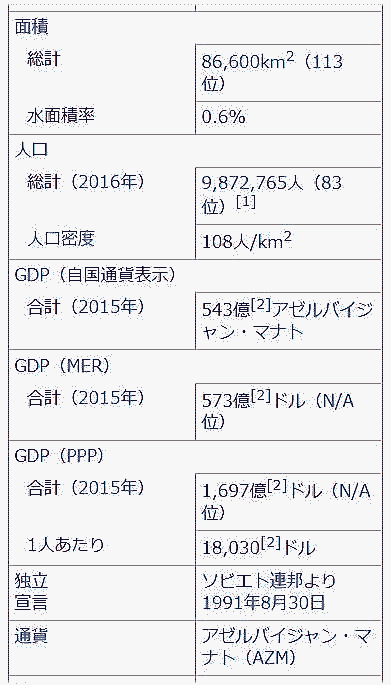 | 総合メニュー(西アジア) アゼルバイジャン1 アゼルバイジャン2 アゼルバイジャン3 アゼルバイジャン4 世界遺産1 世界遺産2 次はアゼルバイジャン1です。 ◆アゼルバイジャン1 ![]() ![]() Source:Wikipedia アゼルバイジャン共和国(Azrbaycan Respublikas)、通称アゼルバイジャン は、南コーカサスに位置する共和制国家。東ヨーロッパに含められることもあります。 北はロシア、北西はジョージア(グルジア)、西はアルメニア、南はイランと国境を接し、東はカスピ海に面します。アルメニアをまたいで西南方に飛地のナヒチェヴァン自治共和国があり、アルメニア、イランおよびトルコと接しています。首都はバクー。アルメニア人が多数居住する西部のナゴルノ・カラバフ地方は、事実上独立した状態となっています 歴史 紀元前後には、アゼルバイジャン人の祖先と見られるアルバニア人の国家(カフカス・アルバニア王国)が作られていました。 歴史的には、イランの東アーザルバーイジャーン州、西アーザルバーイジャーン州とともにイラン高原を支配する政権の統治下にあることが多かったのです。もともとはイラン系の人々が住んでおり、南のイラン高原側と同じくゾロアスター教の拝火壇などの宗教施設が多数建立されていました。 7世紀にアラブの支配下に入ったのちも住民はゾロアスター教徒が多く、シーア派の信徒たちも含めてイスラム教への改宗は緩やかだったようです。 イスラム時代以降この地域は、バクーより北側の地域をシルヴァーン地方、バクー周辺をグシュタースフィー地方、アラス川北岸の内陸部をアッラーン地方、クラ川とアラス川が合流する低地一帯をムーガーン地方と呼んでいまし。 ![]() 11世紀から12世紀に建てられたバクー旧市街の乙女の塔 Source:Wikimedia Cmmons セルジューク朝の時代にオグズ・テュルク系遊牧民(テュルクメン)が進出してテュルク化・イスラム化が進みました。特にイルハン朝時代は、ムーガーン地方周辺が南方のバグダードと並んでイルハン朝君主たちの冬営地に定められた地域でもありました。 またイルハン朝滅亡後はカラコユンル朝やジョチ・ウルス系の諸政権の支配が及ばなかった集団の出入が激しく、これらテュルク・モンゴル系の遊牧勢力の浸透によって、これらの地域の住民のテュルク化・イスラム化はさらに進展しました。一時ティムール朝の支配下にあったものの、イルハン朝滅亡後はこれらの地域を統括できる政治勢力は久しく現れなかったのです。 17世紀にこの地方を拠点にサファヴィー朝が起こり、カスピ海南西岸地域一帯の多くのテュルクメン系の人々がシーア派へ改宗した結果、アゼルバイジャン人(アゼリー人)と呼ばれる民族が形成されて行きました。 アラス川以北の現アゼルバイジャン共和国領は、元来イラン高原に属しウルーミーエ湖周辺のタブリーズやマラーゲを中心とするアーザルバーイジャーン地方とは別個の地域であって、アゼルバイジャンとは呼ばれていませんでしたが、南の東西アーザルバーイジャーン州との民族的共通性から次第にアゼルバイジャンという地名で呼ばれるようになりました。 アルダビール州からカスピ海沿岸部にかけてはタリシュ人のタリシュ・ハン国(英語版)(1747年-1813年)が自治していました。 1804年に始まった第一次ロシア・ペルシア戦争の講和条約・ ゴレスターン条約(1813年)でアゼルバイジャンの大部分がロシア帝国領に編入されました。1826年に始まった第二次ロシア・ペルシア戦争の講和条約・トルコマーンチャーイ条約(1828年)で、ガージャール朝ペルシアのアラス川北岸地域もロシア帝国に割譲されました。 やがてロシアの統治下でアゼリー人の民族意識が高まりました。 1918年、この地域のアゼリー人民族主義者たちは十月革命後の混乱を縫ってアゼルバイジャン民主共和国を打ち立てることに成功しましたが、イギリス軍によって占領され、これに反応した赤軍がバクーに侵攻、ソビエト政権が成立しました。 1922年末、ザカフカース社会主義連邦ソビエト共和国の一部となり、同連邦の解体にともない1936年よりアゼルバイジャン・ソビエト社会主義共和国として直接にソビエト連邦を構成する共和国の一つになりました。 1989年10月5日、共和国主権宣言。1991年2月5日、「アゼルバイジャン共和国」に国名変更。1991年8月30日、共和国独立宣言します。 1991年12月21日、独立国家共同体 (CIS) に参加します。同年12月25日付でソ連邦は解体・消滅。これによりアゼルバイジャンは晴れて独立国家となりました。 政治 ![]() 第4代大統領イルハム・アリエフ 1993年以来、元アゼルバイジャン共産党書記長のヘイダル・アリエフが大統領として政権を掌握し、強権的な政治を引いてきました。2003年にアリエフは健康不安から引退を余儀なくされたが長男のイルハム・アリエフが後継者に指名されて大統領選挙に勝利し、権力の世襲委譲が果たされました。 大統領は、直接選挙で選出され、任期は5年。政府閣僚は、大統領が任