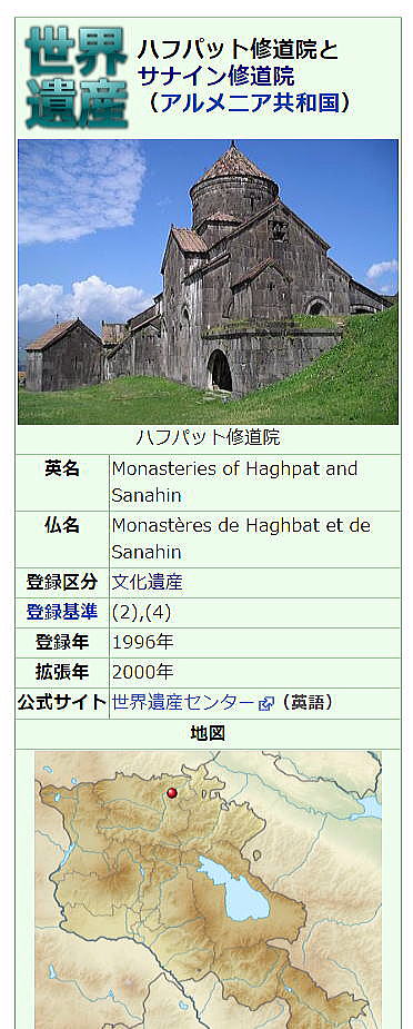 | 総合メニュー(西アジア) アルメニア1 アルメニア2 アルメニア3 エレバン 世界遺産1 世界遺産2 世界遺産3 次はアルメニアの世界遺産1 ハフパット修道院です。 ◆アルメニアの世界遺産 ハフパット修道院 ![]() ![]() ハフパット修道院 パブリック・ドメイン, リンク Source:Wikimedia Commons ハフパット修道院とは、アルメニア・ロリ地方の村、ハフパットにある修道院です。1996年に、UNESCOの世界遺産に登録されました。 歴史 ![]() ハフパット修道院の鐘楼 パブリック・ドメイン, リンク Source:Wikimedia Commons アルメニアは、世界最古のキリスト教を国教とした国家として知られます。 5世紀から7世紀にかけて、アルメニア使徒教会は教義の解釈や建築面において独自の発展を遂げましたが、アラブ人による征服により、その発展は中断を余儀なくされました。 アルメニアの再独立は、9世紀を待たねばなりません。ハフパット修道院が建設されたのは、再独立が達成された以降である970年代です。991年には完成しましたが、度重なる地震が修道院を破壊したのも事実であり、1105年には、セルジューク朝の攻撃を受けました。 主な建築物 ・聖ニシャン聖堂--修道院を構成する建築物の中で最大規模。建築時期は、967年から991年。 ・聖グレゴリウス教会?1005年に建設された教会です。両側に設けられた聖堂は1257年に増築されたものです。この協会の中央部にはドーム上の屋根が設けられています。 ・ハフパットの聖十字架は11世紀から13世紀にかけて刻まれた十字架です。アルメニアで多く見出すことが出来る聖十字架の中でもハフパットの聖十字架がもっとも有名です。 ![]() ハフパットの聖十字架 RaffiKojian http://www.armeniapedia.org - 投稿者自身による作品, CC 表示 3.0, リンクによる Source:Wikimedia Commons 世界遺産 登録基準 この世界遺産は世界遺産登録基準のうち、以下の条件を満たし、登録された(以下の基準は世界遺産センター公表の登録基準からの翻訳、引用)。 (2) ある期間を通じてまたはある文化圏において、建築、技術、記念碑的芸術、都市計画、景観デザインの発展に関し、人類の価値の重要な交流を示すもの。 (4) 人類の歴史上重要な時代を例証する建築様式、建築物群、技術の集積または景観の優れた例。 世界遺産2へつづく |