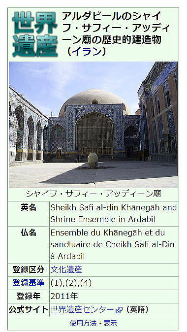 | 総合メニュー(西アジア) イランの世界遺産 世界遺産1 世界遺産2 世界遺産3 世界遺産4 世界遺産5 世界遺産6 世界遺産7 世界遺産8 世界遺産9 世界遺産10 世界遺産11 世界遺産12 世界遺産13 世界遺産14 世界遺産15 世界遺産16 世界遺産17 世界遺産18 世界遺産19 世界遺産20 世界遺産21 世界遺産22 世界遺産23 次はイランの世界遺産11です。 ◆イランの世界遺産11 アルダビールのシャイフ・サフィーアッディーン廟の歴史的建造物 (2010年) ![]() 出典:Wikipedia ![]() アルダビールのシャイフ・サフィーアッディーン廟の位置 出典:グーグルマップ ![]() アルダビールのシャイフ・サフィーアッディーン廟の歴史的建造物 (2010年) オリジナルのアップロード者はペルシア語版Q52のAshena iranさん - 原版の投稿者自身による作品, CC 表示-継承 3.0, リンクによる Source:Wikimedia Commons 概要 シャイフ・サフィー・アッディーン廟は、イランアルダビール州アルダビールにある廟建築です。2010年、UNESCOの世界遺産に登録されまし。登録名は、「アルダビールのシャイフ・サフィー・アッディーン廟の歴史的建造物です。 ![]() イランのアルダビルにあるシェイクサフィの墓 Dr.Hamed - 投稿者自身による作品, CC 表示-継承 3.0, リンクによる Source:Wikimedia Commons 歴史 アルダビールにあるシャイフ・サフィー・アッディーン廟が建設されたのは、1334年のことです。 サファヴィー教団の教祖であるサフィー・アッディーン・イスハーク・アルダビーリーの息子であるサドル・アッディーン・ムーサー(en)が父の死後、建設を指揮しました。 この廟建築には、図書館、モスク、学校、貯水池、病院、厨房、パン工場やそれ以外のオフィスといった機能を持つさまざまなセクションから構成されています。 この廟建築のさまざまな場所で、8つの門で分離されている特色を持ちます。8つの門とは、スーフィズムの8つの行うべき態度を意味します。 サファヴィー朝時代を通して、この廟建築は増築されてきました。複数名のサファヴィー家のシャーおよびハレムの人間がここに埋葬され、また、チャルディラーンの戦いを含むサファヴィー朝が行ってきた戦争の犠牲者もここに埋葬されました。 ◆写真ギャラリー ![]() his is a photo of a monument in Iran identified by the ID مهدی احدزاده - 投稿者自身による作品, CC 表示-継承 4.0, リンクによる Source:Wikimedia Commons ![]() his is a photo of a monument in Iran identified by the ID مهدی احدزاده - 投稿者自身による作品, CC 表示-継承 4.0, リンクによる Source:Wikimedia Commons ![]() This is a photo of a monument in Iran identified by the ID Roohparvar17903 - 投稿者自身による作品, CC 表示-継承 4.0, リンクによる Source:Wikimedia Commons ![]() This is a photo of a monument in Iran identified by the ID Bahar gh63 - 投稿者自身による作品, CC 表示-継承 4.0, リンクによる Source:Wikimedia Commons ![]() This is a photo of a monument in Iran identified by the ID Niloofar mahmoodian - 投稿者自身による作品, CC 表示-継承 4.0, リンクによる Source:Wikimedia Commons ◆アルダビールのシャイフ・サフィーアッディーン廟の歴史的建造物世界遺産への登録基準 この世界遺産は世界遺産登録基準のうち、以下の条件を満たし、登録された(以下の基準は世界遺産センター公表の登録基準からの翻訳、引用)。 (1) 人類の創造的才能を表現する傑作。 (2) ある期間を通じてまたはある文化圏において、建築、技術、記念碑的芸術、都市計画、景観デザインの発展に関し、人類の価値の重要な交流を示すもの。 (4) 人類の歴史上重要な時代を例証する建築様式、建築物群、技術の集積または景観の優れた例。 世界遺産12へつづく |