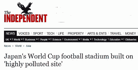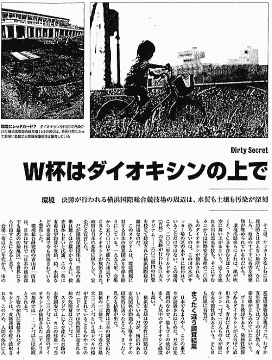およそ信じられないことだが、石原慎太郎氏が巨額の税金を投入し、オリンピックの東京開催を企て、失敗したが、再度2020年にオリンピック東京開催をと言って、石原氏の後釜となった猪瀬新東京都知事がしゃかりきになっている! 東京23区の商店街という商店街には、2020年オリンピックをと言う旗を立てさせ、あらゆるメディアを使って誘致合戦をしている。 何と、民主党の江田五月議員まで以下のようなことを述べている! ◆江田五月 メールマガジン 第1254号 2013年3月4日 東京・マドリード・イスタンブール3都市間での2020年五輪招致合戦が山場に差し掛かり、IOCの評価委員会の視察が、本日から7日まで行われる。一般の支持も高く、本日の衆院本会議では、「国民に夢と希望を与える。(中略)政府、国会が一体となって取り組むべき」との招致決議が賛成多数で可決された。参院でも予定されている。前回の東京五輪では、地下鉄、モノレール、首都高速、新幹線などのインフラ整備が進み、戦後からの復興を世界に発信した。指導者による選手への暴力等の懸念要素を克服し、東京招致を実現して、開催地を越えた全国的支援で、東日本大震災からの復興に資する機会としたい。 しかし、いくら巨額の税金を投入しても2020年オリンピックの実現は難しいと思う。また東京でオリンピックを開催することが何ら東日本大震災の復興に関係するとも思えない。 オリンピック東京誘致も、巨大ゼネコンを利するだけの無意味な「がれき広域処理」や移染にしかならない「除染」同様に、公金の無駄遣い以外のなにものでもないだろう。 ◆Teiichi Aoyama, Decontaminate the Fukushima decontamination project “Josen”(the decontamination of radioactive substances) equals to “Isen”(the relocation of contaminated materials) and to the “Concession”for the related organizations. 邦題:「除染」は「移染」そして「利権」 がれき広域処理には1兆円以上の税金、公金が投入されているが、そんな金があるなら、用地を国、県、基礎自治体が工面した上で、一世帯1000万円を補助し、10万戸の被災者用の住宅を建てるべきである! ある程度規格化したタウンハウスなら、1世帯1000万円あれば建築可能である。それに自分たちの資金を加えても良い。 ところで、私が2020年に東京でオリンピックを開催するのが難しいと思うのは、上記とはまったく別の理由に依っている。 日本政府や福島県は、東京では何ら放射能汚染の影響はないと思うだろうが、世界各国のオリンピック参加選手をあずかる協会は、決してそうは思わないのである。それはセシウムの半減期が30年間であり、2020年は半分にもなっていないこともある。 しかし、それだけでない。放射線量や空気、水などに含まれる放射能、さらにはあらゆる食べ物に含まれる放射能などについて、海外の一流の選手はきわめて敏感なのである。 実は、その昔、日本で国際サッカー連盟(FIFA)主催のワールドカップが開催される時、横浜市が巨額をはたいて開発したヨコハマサッカースタジアムのそばに鶴見川があり、その河川敷から非常に高濃度のダイオキシン類、PCB、重金属類が発見された。 横浜スタジアムと鶴見川の位置関係 出典:グーグルマップ これは横浜スタジアムに首都高速道路からアクセスするためのアプローチ道路を鶴見川の河川敷につくるため掘削をしたときに、掘削土壌中の有害化学物質を国土交通省が調査・分析したところ発見されたのである。しかも、国土交通省は、それらのデータを全面公開した。 環境省(当時は環境庁)は、ダイオキシン類など有害化学物質が検出されたのは、土壌中ではなく、過去に不法に埋められた廃棄物中であり、評価の基準がないとか、例によって直ちに健康への影響はない、などと火消しに躍起になった。何で環境や国民の健康をあずかる環境省が火消しに躍起になったのかは不明だが(笑い)! たまたま当時参議院議員だった中村敦夫さんに依頼され、青山貞一、池田こみちらが現地で土壌や鶴見川の生物を採取し、ダイオキシン類や重金属類などを分析したら、やはり非常に高濃度であることが分かった。 実は、これに関連し日本のメディアの情けない実態をご報告しよう。 現地に皆で土壌などのサンプリングに行くことになり、それならメディアにも連絡しようと言うことで、大手メディア各社に連絡した。しかし、当時、どのこ社もビビッて来なかったのである。東京新聞だけが来ると言ってきたが、結局、現地でいくら待っても記者は現れなかった。 後日、ニューズウィークが青山、池田に取材し、以下のような大きな記事が出たことがきっかけなり、英文で世界中にこのニュースが広まった。 すると、一流サッカー選手をもつ欧州のイタリアやドイツなどから私達に電話が入り、その記事を見た最後はFIFAの選手の健康管理をしている担当者が電話してきたのである。 ![]() Newsweek 日本語版 2001年8月8日 ![]() 英国のインディペンデント紙 結局、日本の行政と大メディアがこの一件にまったく触