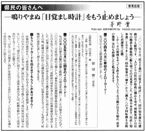 平成18年7月7日 名古屋市中区三の丸一丁目6番1号 中日新聞社 代表取締役社長 大島寅夫殿 茅野實氏の意見広告掲載に関する公開質問状 青山貞一 〒142-0062 東京都品川区小山3-22-22 武蔵工業大学環境情報学部教授 同大学院環境情報学研究科教授 (担当:公共政策論) 前略 貴社の中日新聞、2006年6月15日朝刊に元八十二銀行頭取の茅野實氏が掲載した意見広告「鳴りやまぬ『目覚まし時計』をもう止めましょう」(複写を添付)につき、以下、公開質問致します。到着後1週間以内に郵送にてご回答を下さるようお願い申し上げます。 1. 茅野實氏の意見広告の新聞掲載は、知事選挙告示が迫った段階でのものであり、すでに総務省選挙部の判断においても公職選挙法第129条(事前運動)の適用時期に相当する可能性があるとされております。これは、別紙1の「新聞広告倫理綱領」にあるように、「1. 新聞広告は、関係諸法規に違反するものであってはならない。」という倫理綱領に抵触する可能性があると考えられますが、貴社が違法の可能性がある意見広告を掲載したことについて、どういう見識、見解をお持ちかお聞かせください。 2. 次に、茅野實氏の意見広告の新聞掲載は、公職選挙法第148条の2(新聞紙、雑誌の不法利用等の制限)に抵触する可能性があります。これも、別紙1の「新聞広告倫理綱領」にあるように、「1. 新聞広告は、関係諸法規に違反するものであってはならない。」という倫理綱領に抵触する可能性もあると考えられますが、このことについて貴社はどういう見識、見解をお持ちかお聞かせください。 (新聞紙、雑誌の不法利用等の制限)第148条の2 何人も、当選を得若しくは得しめ又は得しめない目的をもつて新聞紙又は雑誌の編集その他経営を担当する者に対し金銭、物品その他の財産上の利益の供与、その供与の申込若しくは約束をし又は饗応接待、その申込若しくは約束をして、これに選挙に関する報道及び評論を掲載させることができない。 2 新聞紙又は雑誌の編集その他経営を担当する者は、前項の供与、饗応接待を受け若しくは要求し又は前項の申込を承諾して、これに選挙に関する報道及び評論を掲載することができない。 3 何人も、当選を得若しくは得しめ又は得しめない目的をもつて新聞紙又は雑誌に対する編集その他経営上の特殊の地位を利用して、これに選挙に関する報道及び評論を掲載し又は掲載させることができない。 3. 別紙1の「新聞広告倫理綱領」によれば、「本来、広告内容に関する責任はいっさい広告主(署名者)にある。しかし、その掲載にあたって、新聞社は新聞広告が及ぼす社会的影響を考え、不当な広告を除し、読者の利益を守り、新聞広告の信用を維持、高揚するための原則を持つ必要がある。」としています。 茅野實氏の意見広告内容に関する責任は一義的には広告主にあるとしても、新聞社は新聞広告の及ぼす社会的影響からして、また不法、不当な広告を除するという倫理綱領との関連において同規定を逸脱していると思われますが、これについて貴社はどういう見識、見解をお持ちかお聞かせください。 4. 茅野實氏は、かねてより各種新聞の記事上で田中康夫長野県知事に対する批判的意見や非難を開陳されています。しかし、今回の意見広告は知事選挙の告示を間近に新聞上に掲載したものです。しかも、そこでは「2004年8月に最初のイエローカード!」、「2005年3月に2回目のイエローカード!」と中見出しが続き、「もうレッドカードを出させてもらうしかありません!」が3本目となっています。 ご承知のように、Jリーグ発足から満15年。今やサッカーの愛好家にとどまらず、全国津々浦々において「レッドカードを出させて貰う」と断ずる意見広告とは、即ち、長野県知事を辞職せよ、を意味します。しかも「もうレッドカードを出させてもらうしかありません!」は、同時に次の試合への出場停止、すなわち今回の長野県「知事選挙に出る資格はない」と言っているのと同じになります。さらに申せば、ピッチに入ったなら、審判員に場外に追い出されることになります。つまりは立候補するな、 立候補したなら有権者たる審判員に投票するなとっているのが、茅野實氏の意見広告であるといえます。 これらの表現は、1.に述べた公職選挙法の第129条(事前運動)および同法第148条の2(新聞等の不法利用)に抵触する可能性があると同時に、日本新聞協会の別紙2の新聞広告掲載基準 第10項、すなわち、「10.名誉棄損、プライバシーの侵害、信用棄損、業務妨害となるおそれがある表現のもの」であると考えられます。貴社は基準に抵触する広告は掲載しないと言う新聞広告倫理との関連についていかなる見識、見解をお持ちになるかお聞かせください。 5. 周知のように、名誉毀損などに係わる訴訟では、広告であれ記事を執筆した者のみならず、掲載した媒体(新聞、雑誌等)にも損害賠償、慰謝料、謝罪広告等が請求されるのが一般的となっております。 新聞協会の別紙1の「新聞