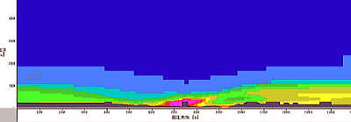 まず、環境総合研究所が調査研究を行うこととなった経緯を青山が説明した後、全員が自己紹介を行ったした。自己紹介でわかったことは、「杉並病」の被害者はもとより、係わった研究者、科学者、医者ら全員が、怒りをもっていることであった。また疲れ切っていることであった。怒りの矛先は、いうまでもなく東京都など行政機関である。全員で約2時間議論した。 以下は各参加者の自己紹介 Aさん(研究者、科学者):つくばにある国(現在、独立行政法人)の研究所にいた。同僚が杉並中継所の近くに住んでいて発症。それ以来、被害者を支援してきた研究者がいた。8年前に支援科学者のグループを作ったが、なかなか思うにまかせずここまできた。空気汚染について調べてきた。 Bさん(大学教員):大学で物理学を教えている。中継所の南側1キロぐらいのところに住んでいる杉並区民だが、平成12年に公害調停の報告書をみて「杉並病」の実態を知った。 Cさん(大学教員):大学の授業で毎年、「杉並病」について講義している。リスク管理が専門だが、影響が出ていることが明らかにもかかわらず原因物質が分からない問題として杉並病は重要と考えている。 Dさん(医師):中継所がある地元で内科医をしている。公害調停は「杉並病」の実態を見ていない。心身症などと言われたが、起こっていることから考えてそのような症状が出るのはあたりまえであって説明になっていない。東京都は今でも硫化水素説に立っているが、硫化水素の問題が起こっていたとしても、それが慢性化するはずはない。東京都は8月で調査をやめてしまっている。そこでは問題が無かったと結論づけるための調査しか行われていないと思う。 Eさん(環境NPO):最初に現場に行って大気を測った。シアンが検出されたがマスコミは取り上げなかった。シアンが原因と指摘してきたにもかかわらず、行政は心因説をとってきた。ずっと追求してきてようやく行政のデータにも出てその中から証拠をつかんできた。 Fさん(研究者、科学者):Aさんに2001年に「杉並病」問題に引きずり込まれた。退職していて時間があったこともあり関わってきた。5年くらいかかったが、問題の所在がだいたい分かってきたので報告会を行った。それで関わりをやめようと思ったが、今回の判決をみて憤りを感じてやる気が出た。 Gさん(弁護士):東京地裁の一審判決は杉並病への理解が全く無いと思う。排気塔や排気口からの有害物質がでるが、希釈、拡散するので住宅地に到達するわけがないと判決で言われている。化学物質過敏症は心因性つまり思いこみと言われている。 Hさん(弁護士):日弁連の公害環境委員会の所属したのが関わりの切っ掛け。一審判決には裁判の過程で釈明もなかったGさんが言われた「拡散」が書かれていた。 Iさん(化学工場の会社員):化学工場で労働者の衛生管理をしてきた。そこで起きていた症状は「杉並病」と似ている。杉並病は報道で知り、5〜6年前の公害討論会にEさんと一緒に参加した。そこで聞いた症状は化学工場の労働者の症状と似ていた。廃プラの中継所はまさに化学工場そのものだと思っている。 Jさん(科学者):理論物理学が専門。杉並区の環境審議会の会長をしていた。Aさんに言われて審議会で取り上げたものの、まともに次の議論にならない。1997年7月から4年間。会長としての責任を感じ関わり続けてきた。東京都と杉並区の報告書を精読し、その矛盾や問題点を整理していることが強みと考えている。 Kさん(弁護士):公調委の時も担当。弁護団を構成するのに時間がかかってしまい、この問題を冷やしてしまった反省がある。これまで情報が出過ぎていたので、今回の環境総合研究所の調査で整理していただきたい。 Lさん(研究者):練馬のゴミも中継所に行っているので区民としても関心がある。宮崎県でも「杉並病」が注目されており、全国からも解決が望まれている。類似施設の立地に関連して相談を受けることも多く汚染の実態を明らかにして行ければと思う。 Mさん(研究者):大気拡散シミュレーションの専門家。調査を通じて分かりやすく問題点を示していきたい。 以下は、青山との間での質疑と議論抜粋 青山の説明: 応用物理学的観点からみて杉並中継所問題に類する問題として厚木基地ダイオキシン問題がある。谷地形にあった産廃焼却工場の20m高の煙突から地を這うような煙の流れをコンピュータモデルを使った数値計算シミュレーションで再現した。 米軍のヘリで煙の流れを現地で確認した。厚木では何年分も廃棄物の搬入をビデオで撮影していた。地形の影響でダウンドラフトで地を這うように大気汚染が流れていた。松葉を使ってモデルで補正した。環境濃度から排出濃度を推定するシミュレーションを行った。 以下は、厚木基地ダイオキシンシミュレーションである。図1が汚染の平面図、図2が汚染の断面図である。汚染が地を這うように流れていることがわかる。ただし、以下は年平均濃度なので各方向の汚染が重合さ