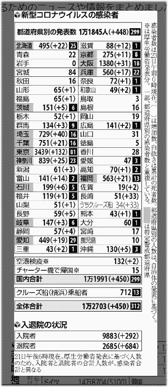 2020年4月5日午前0時現在 ![]() ![]() 出典:読売新聞 2020年4月4日午前0時現在 2020年4月4日午前0時(JST)の日本国内のクルーズ船を含めたCOVID-19の感染者数と死亡者数です。感染者数は3843人、死亡者数は88人と、感染者数が前回に比べ354人増えています。出典は読売新聞です。 , なお、国内外の日単位の状況は以下の独立系メディアに継続的に掲載しています。ここではダイヤモンド・プリンセス号の感染者、死亡者を含めた総数も掲載しています。 ![]() 出典:読売新聞 以下は、青山貞一のフェイスブック(Facebook) ![]() ![]() 2020年4月3日午前0時現在 ![]() 出典:読売新聞 2020年4月2日午前0時現在 ![]() 出典:読売新聞 2020年4月1日午前0時現在 ![]() 出典:読売新聞 2020年3月31日午後10時現在 ![]() 出典:読売新聞 2020年3月31日午前0時現在 ![]() 2020年3月30日午後10時現在 ![]() 出典:読売新聞 ![]() 出典:読売新聞 2020年3月29日現在 これは現状の日本国内における都道府県別の新型コロナウイルスの感染者数の感染が多い順の都道府県と全体マップです。 やはり東京都がアット的に多く、以下大阪府、北海道、愛知県、千葉県、兵庫県、神奈川県、埼玉県...となっています。 ![]() 出典:読売新聞 やはり日本国内の新型コロナ感染者は大幅に増えだしました。 昨日データに繰らべ、202人の増加で2,439人です。死亡者は8人増です。202人増ははじめてです。 以下のように東京都市圏で大幅に増えています。プラスがz先日からの増加数。黒抜きは死亡者数です。 ![]() 出典:読売新聞 ![]() 出典:読売新聞 2020年3月28日 ![]() 出典:読売新聞 2020年3月27日 ![]() 出典:読売新聞 2020年3月26日午後 ![]() ![]() ◆「帰国難民」自己負担60万円も 新型コロナ待機要請で 宿泊は軒並み予約拒否 琉球新報/MSN 2020年3月25日22時現在 ![]() 出典:読売新聞 ![]() 2020年3月25日午前0時現在現在 ![]() ![]() ![]() ![]() ![]() 出典:読売新聞 2020年3月23日午前0時現在現在 ![]() 出典:読売新聞 2020年3月23日の主な感染者、死亡者報道。出典:ニフティーニュース ①愛知県岡崎市80歳の男性死亡、この男性はクルーズ船乗船者。 ②青森県ではスペインから帰国した八戸市の70代男性とその妻の感染が確認。同県での感染確認は初めてである。 ③千葉県では40~50代の外国籍男性3人の陽性を確認。3人は既に感染が判明した邦人男性と同じ貨物航空会社に所属し16日に男性と共に貨物機でオランダからイタリア経由で日本に入国した。 ④東京都では、一日としては最多の16人の感染が判明。うち5人に海外渡航歴があった。これも重要。一切詳しい情報がない。 ⑤岐阜県や京都市などでも感染が確認された。 ◆インフルエンザと新型コロナウイルスの死亡率 ![]() 出典:青山貞一調査 2020年3月22日現在午後10時現在 ![]() 出典:読売新聞