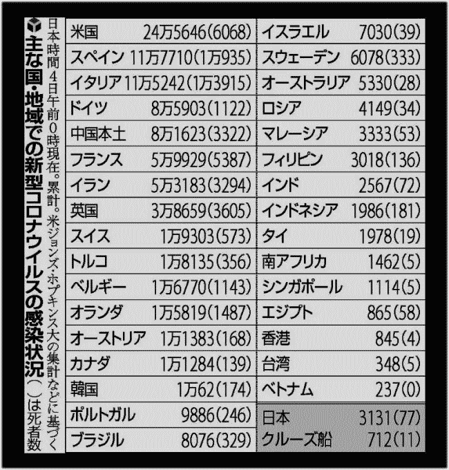 2020年4月4日午前0時現在 世界感染者情報 世界のCOVID-19の感染主要国の感染者数です。米国がダントツで24万5千人を超えています。ついにスペインがイタリアを感染者、死亡者の両方で抜きました。 , 感染者は11万7千710人、死亡者は1万935人で死亡率が10%近くになっています。出典は読売新聞の4月4日午前0時版です。 ![]() 出典:読売新聞 2020年4月3日午前0時現在 世界感染者情報 以下は2020年4月3日午前0時の世界各国の新型コロナウイルス感染者数です。米国が約21万6千人とダントツとなり、イタリア、スペインが約11万人で続いています。一方、死亡者では、イタリア、スペインがダントツで、それぞれ1万3千人を超えています。 ![]() 出典:WHO/読売新聞 以下は世界全体の累積感染者の大陸別集計です。 ![]() 出典:日本経済新聞 20202年4月2日 2020年3月31日現在 世界感染者情報 世界感染者数719,700 死亡者数33,673 国及び地域202 ![]() 出典:読売新聞 2020年3月30日現在 世界感染者情報 WHOのページの更新が終わりました。以下は最新データです。 世界感染者数 634,835 世界死亡者数 29,957 国及び地域数 202 2020年3月29日午前0時現在 ![]() 出典:読売新聞 ◆「韓国診断キット、FDA事前承認獲得…米国に輸出可能に」 ハンギョレ 世界では、米国が中国を抜き感染者は10万人を超えています。その後、イタリア、中国、スペインが続いていますが、中国は増加が止まっていますが、イタリアとスペインは、まだ増加しています。出典は読売新聞です 2020年3月28日午前0時現在 ![]() 出典:読売新聞 2020年3月28日現在 世界感染者情報 ◆Chinese firms can offer to help ‘build makeshift hospitals for India’ if asked Gloal Times 中国企業はインドからの依頼があれば、仮設病院の建設を支援する用意がある。環球時報 ![]() 出典:Gloabal Times 環球時報 ◆Serbia attracts Chinese online fans as joint fight on virus enhances ties Gloabal Times , 中国の新型コロナウイルス防除対策チームが東ヨーロッパのセルビアに向け出発。環球時報 ![]() 出典:Gloabal Times 環球時報 ◆First train with medical supplies for Europe leaves Wuhan as China eases Covid-19 lockdown Gloabal Times 中国が新型コロナウイルス(Covid-19)のロックダウンを緩和しているため、ヨーロッパ向けの医薬品を備えた最初の列車が武漢を出発 環球時報 ![]() 出典:Gloabal Times 環球時報 RT 2020年3月28日午前0時現在 WHO ![]() ![]() 出典:読売新聞 2020年3月27日現在 世界情報 2020年3月26日午前0時現在 ![]() 出典:WHO/読売新聞 2020年3月26日現在 世界情報