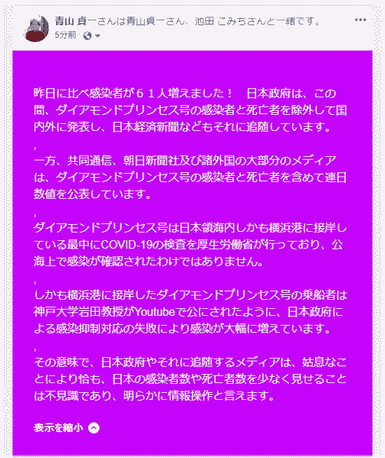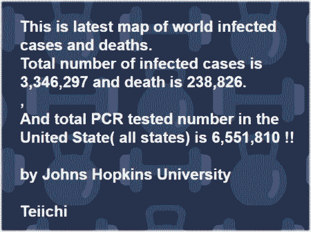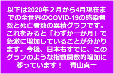 2020年5月28日現在 ◆青山貞一・池田こみち:アジア都市国家と日本都道府県・政令市 CFR比較 2020年5月27日現在 ![]() ![]() 出典:BBCJ 2020年5月25日現在 ![]() ]![]() 2020年5月20日現在 ◆致命率(CFR)による世界各国・地域・グループ別COVID-19リスク評価 青山貞一・池田こみち(環境総合研究所顧問) 2020年5月12日JST0時現在 ![]() 出典:読売新聞 2020年5月11日現在 ★【独自】都感染者に多数の報告漏れ…複数の保健所でミス、100人規模 読売新聞 2020年5月10日JST0時現在 ![]() 出典:読売新聞 ★コロナ感染グラフ、世界中で日本だけ異常な推移と指摘 ニフティニュース 2020年5月5日JST0午前現在 ![]() 出典:読売新聞 ◆PCR検査数「他国より明らかに少ない」…政府の専門家会議、センター増設求める 読売新聞 ![]() 出典: 読売新聞 2020年5月2日JSTevening by Johns Hopkins University ![]() ![]() Source:Johns Hopkins University 2020年5月1日 Johns Hopkins University ◆世界感染者数3,127,126人 死亡者数213,792人 JHU ![]() Source:Johns Hopkins University 2020年5月1日午後 ![]() ![]() 以下は日本時間5月1日、午前0時現在の主要国のCOVID-19の感染者及び死亡者です。 ![]() 出典:読売新聞 ![]() Source:Johns Hopkinc University 2020年4月25日JST0午前現在 ![]() 出典:読売新聞 ◆Number of COPV ID-19 PCR tests by state in the United States (Original data by Johns Hopkins University) Total Test Conducted in U.S. 5,184,635 777,568 tested New York 506,035 tested California 333,099 tested Florida 262,816 tested Texas 226,845 tested Massachusetts 213,686 tested New Jersey 201,617 tested Illinois 192,935 tested Pennsylvania 160,324 tested Washington 144,044 tested Michigan 141,406 tested Tennessee 139,002 tested Louisiana 119,014 tested Georgia 111,379 tested Ohio 105,265 tested North Carolina COVID-19 infcted situation in the United State (26 April 2020) ![]() (Original data by Johns Hopkins University) 以下は読売新聞有料記事のヘッドラインです。NY州ではこの間、抗体検査をしていましたが、何と推定感染者数は270万人と脅威の数です。しかし、昨年のNYの通常のインフルえんざでは1900万人が感染しています。青山貞一 , ◆NY州住民の14%に抗体、推定感染270万人…知事「検査対象は限定的」 読売新聞 2020年4月21日午後10時現在 ![]() 出典:読売新聞 2020年4月21日午前0時現在 ◆世界感染者数2,499,723人 死亡者数171,652人 2020年4月20日午前6時現在 ◆スイスアルプスの名峰に五星紅旗 「愛に国境はない」 人民日報 世界主要国のCOVID-19感染者数と死亡者数 ![]() 出典:読売新聞 This map is latest COVID-19 infected and death in South Korea by Johns Hopkins University. , The number of infected people is 10661, but the number of deaths is 234, which is almost the same as in Japan today. In the future, it is likely that the number of infected people and deaths will increase considerably in Japan, while the number of new infections and deaths in Korea is now almost zero. , Teiichi Aoyama (Tokyo Japan) ![]() Source: Johns Hopkins University ![]() 出典:日本経済新聞 ![]() 出典:日本経済新聞 ★感染対策の国民支持、日本が最低 G7対象の仏紙調査で3月に続き 共同通信 池田から今送られてきた東京都のデータから4月16~17日の比率を見ると、感染者数2,595人、検査者数7,726人であり、比率は0.33でニューヨーク州と同じとなっています。 , 但し、同一人物に複数回検査している場合もあるので、その場合には感染者は1としています。 , 上記のようにくしくもニューヨーク州と東京都は比率が同じ0.33になりましたが、検査数は東京都が二桁少ないことが問題です。 , 青山貞一 2020年4月18日午前7時現在 以下の数字は米国におけるCOVID-19感染有無を調べるPCR検査数。実に、340万人以上。日本のPCR検査数は、その後相当増やしたとは言え13万人~15万人程度。人口比から見ると、日本は現在の10倍以上PCR検査をすべきことになる。 , ![]() 出典:ジョンズ・ホプキンス大学 程度と言うのは厚生省がこっそりと公表しているデータは、14日現在集計中であり暫定値であり、変更される可能性がある。 , 因みに米国の場合、約340万人がPCR検査を受け、約69万人が感染し、約1万4500人が死亡している。検査者の1/5が感染者だ。検査総数に対する感染者総数の割合は、0.2である。ニューヨーク州の場合、検査者数が約55万人で感染者数が約18万人、すなわち比率は0.33である。 , 一方、日本の場合、検査数が未だ確定値ではないのでアバウトになるが、仮に4月16日現在、15万人が検査しているとして、感染数を約9500人とすると、検査総数に対する感染者総数の割合は、0.063と米国の1/3以下である。 , 米国の比率で逆算すると、15万人と言う数字がウソではないかと思える。実際の検査者は以前から池田が言っている5万人程度ではないかと!。検査数が5万人の場合、感染者が9500人で米国とほぼ同じ比率(0.19)になるからだ。 , いずれにしても、日本でも米国のように感染者数をリアルタイムで公表しないと国民から信用されない。日本政府お得意の情報操作、捏造、隠ぺいがここでも疑われてもしかたがない。 , 青山貞一(東京都品川区在住) 2020年4月17日JST午前現在 ドイツ、ロシア、中国、韓国、香港、台湾、ベトナムなどが感染者数の割に死亡者が非常に少ないことが分かります。 ![]
