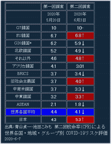 2020年8月10日 ◆青山貞一・池田こみち・鷹取敦: 発症・死亡のタイムラグを考慮した致命率による世界各国COVID-19リスク総合評価 ◆青山貞一・池田こみち・鷹取敦: 第五回 致命率(CFR)による世界各国・地域・グループ別COVID-19リスク評価 2020年7月30日JST22時現在 ![]() 出典:読売新聞 2020年7月26日現在 ![]() ![]() 出典:英国放送(BBC) 2020年6月27日現在 ◆第三回 致命率(CFR)による世界各国・地域・グループ別COVID-19リスク評価 青山貞一・池田こみち(環境総合研究所顧問) 2020年6月12日現在 ![]() 2020年6月7日現在 ![]() ![]() ![]() ![]() 2020年5月30日現在 As of 2020-5-30 JST22 米国のCFR: 5.9 ブラジルのCFR 6.0 ロシアのCFR 1.15 ドイツのCFR 4.5 韓国のCFR 2.4 ![]() 出典:読売新聞: CFRは、死亡者数数と感染者数の間でのタイムラグによって結果が異なる。以下は、タイムラグ0日、タイムラグ9日間、タイムラグ15日間の3つのモデルの比較を試みた結果である。本調査では、タイムラグ0日モデルを用いている。 ◆死亡者数と感染者数のタイムラグとCFRモデル検証 タイムラグによるCFRの違いの実例 CFR単位:%