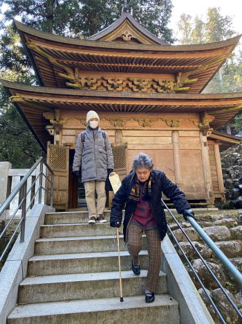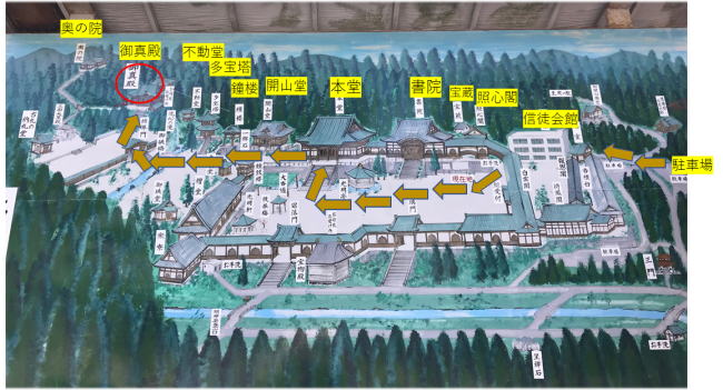 ![]() 撮影:池田こみち iphone 2023年5月 禅寺総合ページ 大雄山1 大雄山2 大雄山3 大雄山4 大雄山5 大雄山6 大雄山7 大雄山大乗寺の主な伽藍(1) 大雄山大乗寺の主な伽藍を紹介するが、以下の全体図は、池田、山形が駐車場に車を置き、石階段を上り御真殿で祈祷を頂くまでを→で示してある。 なお、実際の方位は、右90度が北である ![]() 元出典:大雄山大乗寺 進路矢印は池田こみち作成 以下は主な伽藍(1) ![]() 清滝不動尊 出典:大雄山最乗寺公式Web ![]() 不動堂 撮影:池田こみち iphone 本尊清瀧不動尊、両脇に天祐不動明王・愛染明王を祀る。関東三十六不動の第二番の札所。圓通橋から不動堂を望むと明神ヶ岳山麓から湧水を引いた「洗心之滝」を仰ぐことが出来る。 ![]() 開山堂 出典:大雄山最乗寺公式Web 昭和36年再建。開祖了庵慧明禅師尊像等、歴代住持霊牌を祀る。本堂と共に昭和の総檜造りの名建築である。 ![]() 御真殿 出典:大雄山最乗寺公式Web ![]() 御真殿 撮影:池田こみち iphone 2024-1-17 結界門をくぐり右手の77段の石段を登ると、御真殿(妙覚宝殿)につく。当山守護妙覚道了大薩埵をご本尊に大天狗・小天狗が両脇侍として祀られている。朝晩の祈祷から日中の特別祈祷が、修行される道場。 ![]() 多宝塔 出典:大雄山最乗寺公式Web 文久3年(1863年)建立。多宝如来を奉安、方形層上円形木造二重の塔。南足柄市の重要文化財に指定されている。 ![]() 本堂 出典:大雄山最乗寺公式Web 昭和29年再建。間口15間、奥行き12間。昭和を代表する仏教建築家、伊藤忠太氏の設計である。御本尊は釈迦牟尼仏、脇侍に文殊・普賢両菩薩を祀り、日夜国土安穏が祈念され、朝晩の勤行や当山山主が修行僧に対しての説法の場である。 ![]() 僧堂 出典:大雄山最乗寺公式Web 聖僧文殊菩薩を祀るところから僧堂と云われ、修行僧が日夜、坐禅弁道に励む根本道場である。 ![]() 三面殿 出典:大雄山最乗寺公式Web 三面大黒天(箱根明神・矢倉明神・飯沢明神の三明神が一体に刻まれている)を奉安している。 三面殿の前には珍らしい子供を抱えている「子育ての狛犬」が安置されている。 ![]() 金剛水堂 出典:大雄山最乗寺公式Web 当山開創の時、道了様が自ら井戸を掘り、土中から鉄印を得たが、これが当山重宝の御金印(おかのいん)である。その跡から霊泉(金剛水)が湧出、以来600年、この霊泉を飲むものの諸病を癒していると、伝えられている。 大雄山4へ |