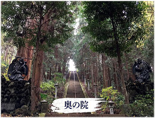 ![]() 撮影:池田こみち iphone 2023年5月 禅寺総合ページ 大雄山1 大雄山2 大雄山3 大雄山4 大雄山5 大雄山6 大雄山7 大雄山大乗寺の主な伽藍(2) ![]() 奥の院 出典:大雄山最乗寺公式Web 鬱蒼とした老杉に囲れた350段余りの階段を登ると、御本地十一面観世音菩薩(当山守護道了大薩埵の御本地)が奉安されている奥の院につく。大雄山のもっとも高い所に位置するが沢山の参詣者がこの階段を登られてお参りに来る。 ![]() 高下駄 出典:大雄山最乗寺公式Web 御真殿脇に奉納された大小の高下駄。天狗さんの履き物は、高下駄だが、下駄は左右一対そろって役割をなすところから、夫婦和合の信仰がうまれ、奉納者が後を絶たない。 ![]() 結界門・御供橋 出典:大雄山最乗寺公式Web 結界門より道了大薩埵の浄域とされる。その手前に御供橋・圓通橋があり、中央に御供橋、両脇に圓通橋が並行している。御供橋は白装束を身にまとった修行僧が道了様へのお供えをする時に使用する為の橋で、普段は通行する事ができないようになっている。この橋は、「かながわ橋 100選」の一つに数えられている。 ![]() 天狗の小径道・御供橋 出典:大雄山最乗寺公式Web 仁王門より3キロメートル。車道とハイキング道「天狗の小径」があり、神奈川県の天然記念物に指定されている杉並木が参拝者を迎える。杉並木は樹齢450年以上のものから600年を数えるものが主流で、更に車道両側には10、000株のあじさいが植えられ「大雄山あじさい参道」と呼ばれて花の見頃は、6月中旬から7月中旬である。 ![]() 仁王門 出典:大雄山最乗寺公式Web 参道の3丁目に位置する、朱色の門「東海法窟」の額と「最乗寺専門僧堂」の聯(れん)を掲げてあり、阿吽の金剛力士像が安置されている。 ![]() 三門 出典:大雄山最乗寺公式Web 平成22年にお寺を建てた、了庵慧明禅師が亡くなってから600年を記念するために建てられて、平成15年10月27日に完成した門です。 門の形は2階建てで一階に屋根がある門で名前は二重門といいます。高さは22mの高い門で二階には、22体の仏像が祀られています。 大雄山5へ |