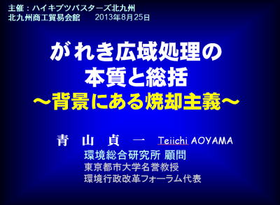 昨日、北九州市で「がれき広域処理の本質と総括〜背景にある焼却主義〜」のテーマで講演し本日午後帰宅しました。講演と質疑で3時間半に及びましたがすべてをIWJが中継していました。 ![]() そもそも、強権的な2つの特措法、それに環境省の子飼い自治体となっている北九州、大阪などが無批判に追随したこと、1兆円を超す巨費をゼネコンの意向にそってゼネコン、焼却炉メーカー、自治体、一部事務組合それに産廃業者にばらまいたことなどを具体的、定量的データをもとに徹底批判しました。細野前環境大臣がしたことは罪深いです。 なお、受け入れ量では、産廃業者など民間事業者が第一位、第二位が自治体、三位がが一部事務組合であり、自治体が受け入れたがれきの量の集計では北九州が22600トンで第一位、大阪が第二位で11600トンでした。 会場には山口県からも駆けつけられ、質疑で宇部市の住民が上関原発に触れられました。私からは政策学校一新塾卒塾生の宇部市長について、どうですか?と逆質問するなど、多くの質問がでるなど関心の高さをうかがわせました。 がれき広域処理問題では、北九州ではがれき搬入強行で逮捕者がでました公務執行妨害と道路交通法違反とのことでしたが、いずれも不起訴となっています。一方、福岡市の生活保護を受けている女性が逮捕、起訴され、その後も拘留されているそうです。 以下がIWJの録画版です。音声が聞きづらいかも、知れませんが、 パワーポイント画像はかなり文字もみえるはずです。 ◆青山貞一さん講演会「ハイキブツさよなら!」 日時:8月25日(日)13:00開場 13:30開演 場所:北九州商工貿易会館601号室 ![]() 講演中の青山貞一 in 北九州 IWJ_FUKUOKA1 URL(録画版) 青山貞一さん講演会「ハイキブツさよなら!」(前半) http://www.ustream.tv/recorded/37770221 青山貞一さん講演会「ハイキブツさよなら!」(後半) http://www.ustream.tv/recorded/37775033 |