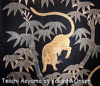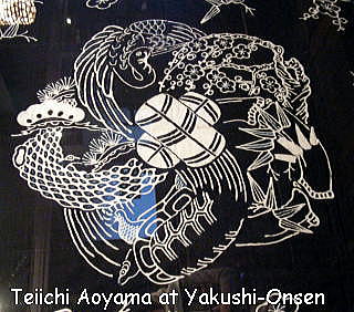 ところで、薬師温泉・かやぶきの郷では江戸時代の民具、衣装なども必見だ。「紺屋の白袴」という言うことわざがあるが、その紺屋が染めた秀逸な染め物も見物のひとつ。 以下は2010年のゴールデンウィーク来訪時に撮影した写真である。いずれも日本の中山間地の農家の文物を今に伝える貴重なものばかりである。