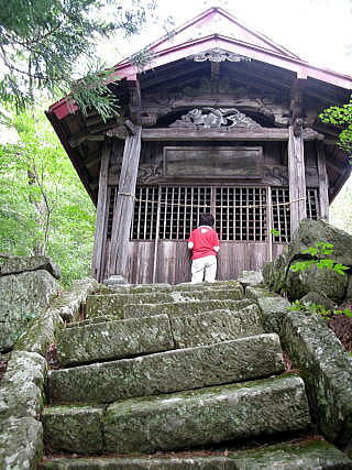 ところで、赤岩神社に参拝にゆくのなら、何もそんな大仰に深くに考えず行けばいいじゃないかと思うだろう。だが、「赤岩神社」は、非常に険しい山の崖の上にあって、健康そして健脚のひとでも、そう簡単にたどりつけないのである。 車が通れる赤岩村落の道から最上段の本殿までは、おそらく標高で100m弱ある。 しかも途中、何カ所かある別々の石の階段は、いずれもステップが狭い。その石のステップもボロボロで朽ち果てている。 いつ何時崩れ落ちるか分からない。 さらにがけの上にある神社の上に本殿があり、そこに行く階段も林道も何もない。そんながけを登らないとお参りする本殿にはたどり着けないのである。 今回、青山は下の写真にある入り口の数段の石段で滑り、危うく頭を打つところであった。前日夜からの降雨でコケが湿っていたところに、いきなり登山靴が斜めに入ったためだろう。 ![]() 最初に石段に上る池田さん。青山はここで転けてしまった(笑い) 撮影:青山貞一 Nikon CoolPix S8 上から見ると下の写真のようになる。 ![]() メインストリートから階段を20段ほどあがったところ 撮影:青山貞一 Nikon CoolPix S8 ![]() 道路から数段上がった神社参道の入り口 左は奈須さん 撮影:鷹取敦 Digital Camera Casio ![]() 坂道を登る途中の左右に灯籠がある 撮影:青山貞一 Nikon CoolPix S8 ![]() この後、写真のような林道のような参道をかなり登る 撮影:青山貞一 Nikon CoolPix S8 ![]() 途中にあった井戸にて 撮影:青山貞一 Nikon CoolPix S8 ![]() 参道を行くとはじめて本格的な石段がある。 撮影:青山貞一 Nikon CoolPix S8 さらに行くと、下の写真にあるような崩れ落ちそうな石段が続く。 ![]() 石灯籠からさらに崩れかかった石段が40−50段続く 撮影:池田こみち Nikon CoolPix S10 ![]() 撮影:青山貞一 Nikon CoolPix S8 下の写真は上の階段を上ったところから下をみたところである。 ![]() 登る途中から下を見たところ 撮影:青山貞一 Nikon CoolPix S8 やっと神社の拝殿に到着。 ![]() 赤岩神社の拝殿。 木造で相当の年数がが経っている 撮影:青山貞一 Nikon CoolPix S8 拝殿まで登ると、結構疲れる。 ![]() 撮影:鷹取敦 グロッキーの青山! ![]() 撮影:池田こみち Nikon CoolPix S10 この後、拝殿の背後にある本殿に登る! ![]() 拝殿の後にある上の写真の階段は途中で無くなっていて、 上の写真から上には登れない 撮影:青山貞一 Nikon CoolPix S8 下は本殿側から拝殿側を見た写真。拝殿と本殿の間は途中で階段がとぎれていて、遠回りして山を登ることになる。 ![]() これは本殿から下にある拝殿を写したもの 撮影:青山貞一 Nikon CoolPix S8 下の2枚の写真は2010年8月に来たときに配電から本殿に登ったときのもの。 ![]() 拝殿から脇の断崖を登った上で本殿に登る石段を登る 撮影:青山貞一 Nikon CoolPix S8 ![]() これが断崖絶壁の上にある本殿。ここでも参拝 撮影:青山貞一 Nikon CoolPix S8 2010年8月に来たときは、本殿のさらに上部への登山を試みた(下の写真2枚)しかし、このときは登山の準備をしてこなかったこともあり、途中で引き返した。地域の子ども達はこの上まで登っていた。 ![]() 池田さんは本殿からさらに上の崖への登山にトライした 撮影:青山貞一 Nikon CoolPix S8 ![]() 結局、危険なので折り返した 撮影:青山貞一 Nikon CoolPix S8 下の写真は本殿内部を写した写真である。 ![]() 本殿は入れない。本殿の外から写した内部 撮影:青山貞一 Nikon CoolPix S8 本殿で参拝する。 しかし、本殿から拝殿に降りるのも結構大変。慎重に! ![]() 撮影:池田こみち Nikon CoolPix S10 かくして、最初につまづいた私であったが、拝殿、本殿でお参りし全員無事に車がおいてある道路まで下山できた! ![]() 撮影:池田こみち Nikon CoolPix S10 つづく |