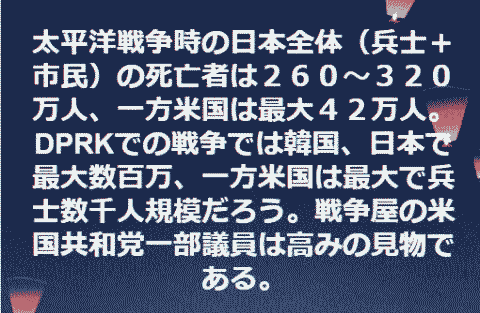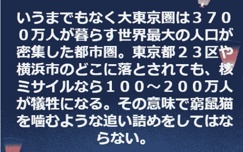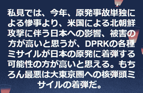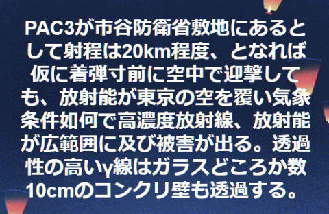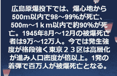 | 関連スレッド<日中韓朝|戦争・人間・環境> 検索ワード:北朝鮮 DPRK 弾道ミサイル 核弾頭 原爆 PAC3 S400 γ線 放射線 中性子線 東京大都市圏 以下は青山貞一のフェイスブックからの転載です。 ![]() ![]() 東京大都市圏(約3700万人)の経済規模 以下は東京大都市圏(約3700万人)の経済規模を丸の大きさで表している。大阪・神大戸都市圏やソウル・インチョン大都市圏(韓国)よりはるかに大きく、世界一である。 ![]() 出典ブルッキングス研究所(米国) ![]() 原爆による死亡原因には、 @衝撃波によって吹き飛ばされたり、地震のように建築物、家具など 下敷きになり亡くなる場合 A高度な熱線による火傷による死 B放射線(γ線、中性子線)被爆によるもの があります。以下は、Bの放射線(γ線、中性子線)被爆によるものの説明です。 放射線被爆によるものは2種類に大別されます。 @核分裂直後に発生した中性子により放射化された物からの被曝。高線量率の短時間被曝となります。 A核分裂で発生した核分裂生成物からの被曝。低線量率の長時間被曝となります。 原爆の場合、γ線以外に中性子線が問題になる。核爆弾は爆発時に90%のガンマ線(γ)を放出し、10%の中性子線を放出したという調査研究記録がある。 ![]() 註:広島市への原子爆弾投下 - Wikipedia 原爆による死亡者 爆心地から500メートル以内での被爆者では、即死および即日死の死亡率が約90パーセントを越え、500メートルから1キロメートル以内での被爆者では、即死および即日死の死亡率が約60から70パーセントに及んだ。さらに生き残った者も7日目までに約半数が死亡、次の7日間でさらに25パーセントが死亡していった。 11月までの集計では、爆心地から500メートル以内での被爆者は98から99パーセントが死亡し、500メートルから1キロメートル以内での被爆者では、約90パーセントが死亡した。1945年(昭和20年)の8月から12月の間の被爆死亡者は、9万人ないし12万人と推定されている。 ![]() PAC3(米国製MD) 出典:自衛隊公式Webなど 自衛隊のウエブサイトによると、射程距離は15キロメートルから20キロメートル。つまりPAC3を配置した場所から半径20キロメートル以内に落ちてきたら、地上に落ちる前に空中で爆破するという。または、落ちてくる途中に半径20キロメートルを通過するようならば、そこで破壊するということも可能。 ![]() PAC3の配備地域 ![]() 東京都新宿区市谷本村町にある防衛省から半径20kmの範囲 出典:グーグルアース ![]() ミサイル防衛(MD)の概念図 <参考> S-400(ロシアのMD) ロシア資料によれば、S-400 「トリウームフ」は、ロシア連邦で開発された多目標同時交戦能力を持つ超長距離地対空ミサイルシステム。S-400は400km先の六つの目標に対する同時処理能力を有しているとされる。さらには高次元の対ステルス戦能力も備えているとされる。 ![]() 写真はS−400 出典:Sputnik ![]() ![]() 註:第二次世界大戦における被害者数は、先日作成した以下の表によっている。 , ◆碧山貞一:図表に見るWW2の犠牲者数 Military Victims in WW2 ![]() 追記 ◆東京大都市圏への核弾頭ミサイルの着弾は、 日本の経済そのものを破壊する ところで以下の地図における〇の大きさは、都市圏のGDP、つまり一人当たりGDP(ppp)×人口数を現した地図です。〇の大きさが都市圏のGDPを表しています。この地図は米国のブルッキングス研究所が作成したものです。 , 東京大都市圏(投稿、神奈川、千葉、埼玉、栃木、群馬、茨城)は約3700万人で世界一のGDPを誇りますが、一人当たりGDP(ppp)では、世界300都市圏中、何と211位に過ぎません。ただし、数値は2014年のものです。 , ところで、日本のなかでの都市圏GDP比較では、大阪・神戸や名古屋、福岡・北九州など他の都市圏と比べると、いかに東京大都市圏の経済規模が大きいかが分かります。 , 世界300都市圏中、何と211位であっても、これだけ一体的に巨大な人口を抱えると大きくなるのですが、昨日お示しした、DPRKの核弾頭ミサイルが、この〇の中心に着弾すると、犠牲者数だけでなく、日本の経済がひとたまりもなく破壊することを私たちは知らねばなりません。 ![]() 出典ブルッキングス研究所(米国) |