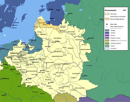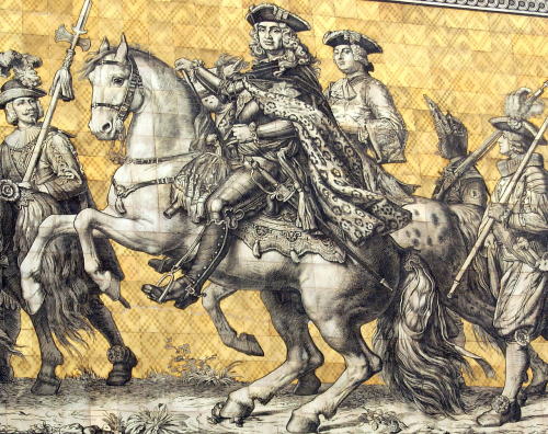 | 総合メニューに戻る ◆アウグスト二世(ポーランド王) ![]() Louis de Silvestre-August II Source:Wikimedia Commons ルイ・ド・シルヴェストル - Nationalmuseum Stockholm, パブリック・ドメイン, リンクによる はじめに アウグスト2世モツヌィ(ポーランド語: August II Mocny, 1670年5月12日 - 1733年2月1日)は、ポーランド・リトアニア共和国の国王(在位:1697年 - 1706年、1709年 - 1733年)、及びザクセン選帝侯(在位:1694年 - 1733年)です。 ザクセン選帝侯としてはフリードリヒ・アウグスト1世(ドイツ語: Friedrich August I.)です。 驚異的な怪力の持ち主であったことから「強健王(Mocny)」「ザクセンのヘラクレス」「鉄腕王」などの異称で呼ばれ、またその異称の所以を証明するために素手で蹄鉄をへし折るのを好んだそうです。 先祖であるポーランド人のツィンバルカ・マゾヴィエツカも、また怪力で有名でした。アウグストはハプスブルク帝国の同盟者の一人として金羊毛騎士団の騎士に叙任されていました。 ザクセン選帝侯としては、アウグストはおそらく芸術と建築のパトロンとして記憶されています。彼はザクセン選帝侯国の首都ドレスデンを主要な文化的中心地に変え、ヨーロッパ中から芸術家や音楽家を宮廷に招聘しました。 アウグストはまた優れた芸術作品の蒐集家で、ドレスデンとワルシャワに美しいバロック様式の宮殿を建設した。一方で、政治家としての力量に関しては、ポーランドにおいては決して高くは評価されておらず、ポーランド・リトアニア共和国を大北方戦争に巻き込んだ張本人として非難されています。 アウグストの国内改革と王権強化の試みは結果的に無意味であり、さらにその政策は共和国に対するロシア帝国の影響力を強めることになったと考えられています。 選帝侯時代 ![]() ヤン・マテイコによる肖像画 Source:Wikimedia Commons パブリック・ドメイン, リンク ![]() ヴェッティン家支配期のポーランド・リトアニア共和国の国章 Source:Wikimedia Commons 投稿者自身による作品このSVGのソースコードは正しい.この ベクター画像はInkscapeでJimmy44により作成されました., CC 表示 3.0, リンクによる 1670年、ヨハン・ゲオルク3世とデンマーク王フレデリク3世の娘アンナ・ソフィーとの間の下の息子として、ドレスデンで生まれました。 次男だったアウグストは選帝侯の座を継ぐことは出来ず、1691年9月12日に父が死ぬと兄ヨハン・ゲオルク4世が選帝侯と公国を相続しました。 1693年1月20日、アウグストはブランデンブルク=バイロイト辺境伯クリスティアン・エルンストの娘クリスティアーネ・エーベルハルディーネと結婚し、夫妻には一人息子フリードリヒ・アウグスト(後のアウグスト3世)が生まれました。 ヴェネツィアのカーニヴァルを遊覧した際、兄ヨハン・ゲオルク4世は愛妾マグダレーネ・ジビレ・フォン・ナイトシュッツから天然痘をうつされました。 1694年7月24日、兄が嫡出子を残さないまま急死したため、アウグストがフリードリヒ・アウグスト1世として選帝侯を継ぎましだ。1696年に大トルコ戦争におけるドナウ川方面の司令官に任命されましたが、一向に戦果を挙げられず翌1697年にプリンツ・オイゲンに交代させられました。 ポーランド・リトアニア共和国の国王選挙に出る資格を得るため、アウグストはカトリックに改宗しました。ザクセンの選帝侯たちは伝統的に「宗教改革の擁護者」と呼ばれ、選帝侯国はドイツにおける福音主義教会の拠点であったため、アウグストの改宗は世間を驚かすものでしたが、何ら抗議を受ける事はありませんでした。 しかしカトリック教徒となったザクセン選帝侯は、帝国議会における新教徒派の指導者の地位をブランデンブルク=プロイセンに奪われることになり、ザクセン選帝侯はザクセンの宗教的一体性を保障して来たため、アウグストの改宗によって福音主義教会信徒臣民の一部が公国を離れることになりました。 アウグストの王位獲得の野心のために、ザクセンの国庫から出された莫大な資金がポーランドの貴族や聖職者への賄賂に消え、同時代人はアウグストの王座への執念を「ポーランドへの投機」と呼んで嘲われました。 神聖ローマ帝国において、カトリック諸侯会議に対抗する新教徒諸侯会議の議長役はザクセン選帝侯に決まっており、アウグストはカトリックでありながら議長を務めることになりました。 帝国内におけるアウグストの教会政策は正統派ルター主義でしたが、後にはカトリックと絶対主義に変わりました。帝国内の新教徒諸侯と残り2人の新教徒選帝侯(ハノーファーとブランデンブルク=プロイセン)は、ザクセンが新教徒陣営に一貫して居続けるのかどうか不安に感じていました。 アウクスブルクの和議により、アウグストは理論上はカトリックを公国の体制宗教に設定することが可能であり、少なくともカトリックの臣民に完全な宗教的自由を与える権限を持っていましたが、これらの権限が行使されることはありませんでした。ザクセンはその後もルター派領