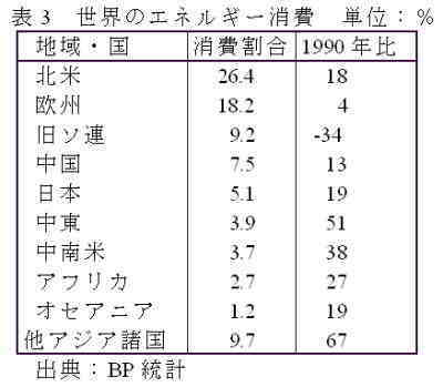 米国の軍事費のガリバー化を決定的なものとしたのは、2001年9月11日の同時多発テロである。米国はテロ対策を口実に対テロ戦争を拡大し、大幅に軍事費を増加させている。2002年1月29日、ブッシュ大統領が行った上下両院合同議会での一般教書演説では、@対テロ戦争の拡大、A本土防衛の強化、B経済回復について触れ、とりわけテロ戦争の拡大を強調した。 イラク、イラン、北朝鮮を「悪の枢軸」と名指し、イラクには2002年内にも軍事行動を辞さないとまで言明している。これを受け2002年2月4日、ブッシュ大統領は予算教書を上下両院に提出した。それによると2002年10月から2003年9月の軍事予算は前年度比で15%増、2002年度の予算教書対比で22%増とされている。仮に2002年度の世界の軍事費総額を8500億ドルとした場合、米国一国が実に40%近くを占めることになる。 次に、軍需産業面を見よう。表2は契約高で見た2001年度の世界の軍需産業ランキングである。米国は北朝鮮やパキスタンなの核拡散だけでなく、他国の通常兵器などの武器輸出もことあるたびに牽制し続けている。だが、表の20社を見ると米国の軍需企業が11社と過半を占め、米国の上位3社の総契約額は20社総額の40%以上を占めている。 ![]() ところで、同時多発テロ後のアフガン攻撃と対テロ戦争拡大のなかで、米国の軍需産業は空前の利権を得ている。アフガン戦争直後の2001年10月26目、米国防省は次世代戦闘機の開発と製造を軍需企業のトップ、ロッキード・マーティンに委託することを決めた。 受注契約高は2000億ドル、実現すれば史上空前の契約となる。2000億ドルと言えば表2の総額1105億ドルの約2倍である。ロッキード社が獲得した戦闘機の生産は米国用にとどまらず、同盟国英国、日本などでも、今後主力の戦闘機になる。主力戦闘機は、F16戦闘機やA10攻撃機、FA18戦闘機などに代わるもので、空軍1763機、海軍480機、海兵隊609機が購入予定されている。英国も空軍と海軍が150機購入、米英だけで約3000機の需要になる(2)。 史上空前の契約後、ロッキード社の株が高騰し、CEOらは「不況のなかこの受注によって危機を脱した」と述べている。まさに米英では軍需産業が最大の公共事業となっていることが分る。 ■世界のエネルギー情勢と米国 筆者は、「米国のテロ報復戦争の愚」(1)の中で米国が中東で起こす戦争には、いつもエネルギー争奪や権益の確保があると言ってきた。これは第一次中東戦争でも、湾岸戦争でも、アフガン戦争でも変わらない。そこで次に、世界のエネルギー情勢と米国の関係について見てみたい。 2000年時点での世界のエネルギー消費は、石油換算で87.5億トンである。10年前の1990年との対比では11%増である(3)。表3の最新統計によれば、地域別割合は北米が26.4%,欧州18.2%、旧ソ連9.2%、中国7.5%、日本5.1%となる。北米の割合がEU全体よりも大きく、他地域を大きく引き離している。伸び率では旧ソ連はこの10年間で34%も減少しており経済の凋落がわかる。世界全体の26.4%を占める北米だが、米国はその81%、一国で全世界の23%の消費を占めている。 世界のエネルギー消費を一次エネルギー別に見ると、石油39.4%、天然ガス24.8%と、両者で64.2%を占めている。このうち石油は、米国が全世界の25.2%、日本8.1%、ドイツ4.2%、CIS3.9%、中国5.2%など、米国の消費割合が圧倒的に多い(4)。 1998年から1999年のエネルギーの対外依存率(5)では、米国の全エネルギーの輸入依存率は25.6%、石油が58.4%である。全世界の石油の24.7%を米国、15%を日本が輸入している。さらに世界の一人当たりのエネルギー消費を1999年の年間電力消費(実績値)で示すと、米国が16mwh/人、1998年対比で25%も増加している。ちなみに日本は6.5mwh/人、ドイツは6mwh/人である。米国人は日本人の2.5倍、ドイツ人の2.7倍の電気を使っていることになる。 ![]() ![]() 図3 世界のエネルギー消費割合 次に、エネルギー供給について見てみよう。石油生産量(6)は全世界で現在、1日6534万バーレル、そのうちOPEC加盟国が2781万バーレル、42.6%となっている。 国別ではサウジが12.7%で一位、旧ソ連諸国10.9%、米国9.6%、イラン5.7%、中国とベネズエラが4.9%、メキシコ4.7%、ノルウェー4.5%、英国3.8%、UAE3.5%、イラク3.3%、クウェイト3.1%と続く。1998年末の採掘可能原油量(石油埋蔵量)(7)は、サウジが全世界の25%、イラク11%、UAE、クウェイト、イランが9%、ベネズエラ7%、旧ソ連とメキシコが5%、その他が18%で米国は2%にすぎない。 中東5カ国で世界全体の実に63%、イラクとイランで20%を占めている。可採埋蔵量を同年の生産量で割った可採年数は、1998年末でイラクが140年強、クウェイト130年弱、UAE120年弱、サウジ85年、イラン70年弱と、ここでも中東諸国が圧倒的に多いことが分かる。世界の平均可採年数は44年、米国はわずか7年である(3)。 ![]() 図4 世界の石油採掘可能原油割合(1998年末) 天然ガスについて見ると、1998年末の埋蔵量は、旧ソ連諸国が全世界の36%、イラン15%、アジア大洋州8%、アフリカ諸国、カタールが7%、中南米、その他欧州が5%、