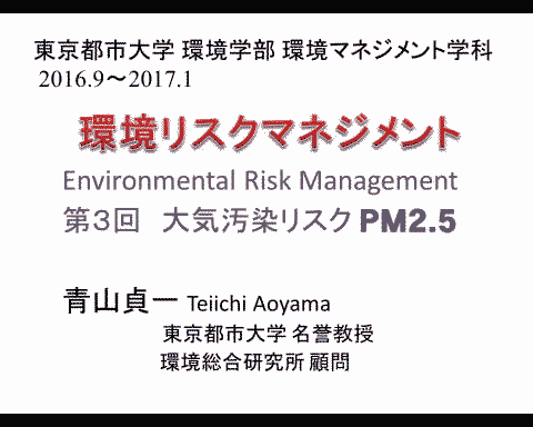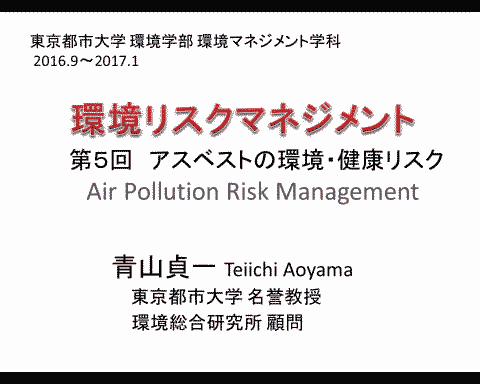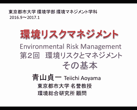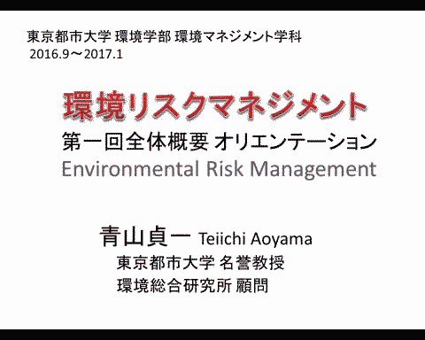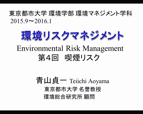 以下は青山貞一が東京都市大学環境学部環境マネジメント学科で2011年9月から2016年1月まで担当した「環境リスクマネジメント」の講義概要です。対象は一学年(文系)です。 なお、授業一コマは100分です。 1回目 オリエンテーション 2回目 環境リスクとマネジメント、その基本 3回目 大気汚染リスク、PM2.5 とマネジメント 4回目 喫煙リスク とマネジメント 5回目 アスベストリスク とマネジメント 6回目 ごみ焼却と環境リスク1 7回目 ごみ焼却と環境リスク2 8回目 ごみ焼却リスクのマネジメント カナダと日本 9回目 原発の環境リスク1 10回目 原発の環境リスク2 11回目 原発環境リスクのマネジメント 11−2 再生エネルギーによるリスクのマネジメント 12回目 地球温暖化の環境リスク1 13回目 地球温暖化の環境リスク2 13−2 大規模山林火災のリスク 米国カリフォルニア州 14回目 戦争と環境リスク ベトナム戦争、湾岸戦争 ![]() 2回目から14回目までの概要をオリエンテーションとして紹介。 ![]() ![]() ![]() ![]() ![]() ![]() ![]() ![]() ![]() ![]() ![]() ![]() ![]() ![]() ![]() ![]() ![]() ![]() ![]() ![]() ![]() ![]() ![]() ![]() つづく |