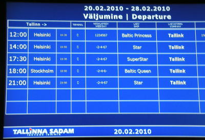 下は2月20日のヘルシンキやストックホルム行きの高速艇や大型客船、フェリーなどの時刻表である。この季節はあまり便数が多くない。往復切符を買うとかなり割安となる。