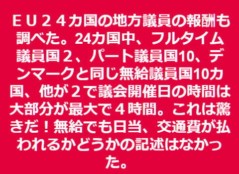 <関連スレッド:地方 国際 沖縄 首都圏> 以下は青山貞一のフェイスブックからの転載です。 ここではEU24カ国について各国地方議会における議員報酬について調べています。 ![]() ![]() ![]() 以下は上記の出典と表である。 データ出典: Governance Committee CG/GOV05(2017)04 27 April 2017 Financial compensation of local and regional elected representatives and public officials in the exercise of their office (art. 7.2. of the European Charter of Local Self-Government) |