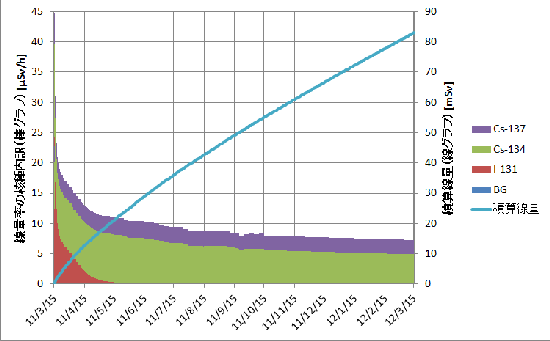 1.はじめに 本論では、福島県飯舘村長泥地区を対象として国設福島市モニタリング・ポスト、福島県による時系列測定および東京都市大学と環境総合研究所の現地測定データを用い、2011年3月15日〜10月末におけるγ線外部被ばくの積算値を推計した。 2.使用した測定データ 本論では、以下に示す3つのデータを用いた。 @飯舘村に設置している国設モニタリング・ポストの時間データ これは主として、事故直後の2011年3月15日〜3月17日の時間値データとして用いた。国設飯舘のモニタリング・ポイントでは、3月15日の午後4時に20.7μSv/h、3月15日の午後6時20分に44.7μSv/h、3月16日の午前9時に、31.0μSv/h、3月17日の午前10時10分に、23.4μSv/hを記録していた。 A福島県が飯舘村長泥で測定した時系列データ これは福島県により2011年3月26日〜10月20日の期間、毎日単位で測定されている。測定高は地上1m。 ◆福島県県内各地の放射線量の推移 B東京都市大学青山研究室と環境総合研究所による福島県内放射線量の時間測定データ この測定は2011年6月19日に福島県飯舘村で行われ地上1mと地表面の両方を測定している。 ◆東京都市大青山研究室・環境総合研究所:福島放射線測定現地調査 ![]() 撮影:青山貞一 ![]() 地上1mでの放射線測定(飯舘村にて) 撮影:青山貞一 ![]() 地上5cmでの放射線測定(飯舘村にて) 撮影:青山貞一 上記データ(詳細は別途)を使用し外部被ばく量の積算を試みた。ただし、測定していない日は、内挿法(一部外挿)により近似値を求めている。測定高は地上1m、自然線量は除外してある。 3.外部被ばく積算値(推計値) すべて福島県飯舘村長泥地区の屋外にいたと仮定した場合の積算値は、事故後最初の一か月(3/15〜4/15)で約13ミリシーベルトとなった。 さらに2011年10月15日までの積算値は約54ミリシーベルト、さらに来年の3月14日までの予測値は約82ミリシーベルトと推定された。これらはバックグラウンド(0.05μSv/h)を含めない屋外にいる場合の積算線量である。 なお、筆者らが2011年6月に飯舘村で行った地上1mと地表面での実測では、地表面が約35%、地上1mより高かったことから、地表面での積算値は上記の値よりかなり高くなるものと推定される。 上記はいずれも試算であり、より詳細なデータが入手できた時点で再推計する予定である。 以下はヨウ素131、セシウム134、137を想定した「福島県飯舘村長泥地区における放射線外部被ばく積算量の推計」のグラフである。 ![]() 図1 福島県飯舘村長泥における放射線外部被ばく積算量の推計 さらに、140年後までの年間積算線量を試算すると以下のようになった。 1年目:81.8mSv/年 2年目:50.1mSv/年 3年目:41.2mSv/年 4年目:34.6mSv/年 5年目:29.8mSv/年 10年目:18.9mSv/年 20年目:13.5mSv/年 30年目:10.7mSv/年 40年目: 8.5mSv/年 50年目: 6.7mSv/年 60年目: 5.3mSv/年 70年目: 4.2mSv/年 80年目: 3.4mSv/年 90年目: 2.7mSv/年 100年目: 2.1mSv/年 110年目: 1.7mSv/年 120年目: 1.3mSv/年 130年目: 1.1mSv/年 140年目: 0.8mSv/年 上記はバックグラウンド(0.05μSv/h)を含めない場合の積算線量である。 4.評価について 福島県飯舘村は、福島第一原発が設置されている双葉郡内の基礎自治体以外では、もっとも放射性物質汚染、放射線、放射能の著しい影響を受けた地域である。 飯舘村長泥内における屋外の積算外部被曝量は、3/15から1か月間で約13mSv、3/15から半年の間に受けた積算外部被曝量約54mSv、1年後には約82mSvとなることがわかった。 また年間の積算線量が1mSv以下となるには、実に140年間を要することも分かった。 |