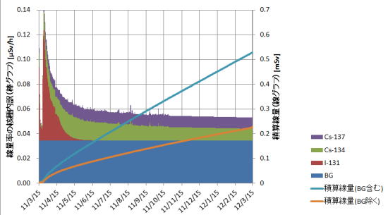 1.はじめに 本論では、東京都新宿区を対象として国設東京都新宿区モニタリング・ポスト(文科省設置、東京都管理)のデータを用い、2011年3月15日〜10月末におけるγ線外部被ばくの積算値を推計した。 2.使用した測定データ 本論では、以下のデータを用いた。 東京都健康安全研究センター測定の時間データ 東京(新宿)のモニタリング・ポイントでは、東京で初期降雨があった3月21日の午後8時に0.07μSv/h、3月22日の0時00分に0.142μSv/h、23時に、0.154μSv/h、3月24日の午前9時に、0.138μSv/hを記録していた。 上記センターは、東京都新宿区で2011年3月15日以降現在まで空間放射線量を測定している。以下はそのデータである。 http://monitoring.tokyo-eiken.go.jp/mon_air_week_list.html 上記データ(詳細は別途)を使用し外部被ばく量の積算を試みた。測定高は地上18m+1.8m、測定は自然線量は含めている。ここでは、福島第一原発事故以前の自然放射線量を0.0345μSv/h(事故直前の実測値平均)と前提している。 3.外部被ばく積算値(推計値) 以下はヨウ素131、セシウム134、137を想定した「東京都新宿区における放射線外部被ばく積算量の推計」の2011年3月15日から2012年3月15日までの放射線量および積算線量グラフである。 ![]() 図1 東京都新宿区における放射線外部被ばく積算量の推計 さらに、70年後までの年間積算線量を試算すると以下のようになった。 年間積算線量 年間積算線量 (BG含む) (BG除く) 1年目:0.53mSv/年 0.23mSv/年 2年目:0.45mSv/年 0.14mSv/年 3年目:0.43mSv/年 0.12mSv/年 4年目:0.41mSv/年 0.10mSv/年 5年目:0.40mSv/年 0.09mSv/年 10年目:0.37mSv/年 0.07mSv/年 20年目:0.35mSv/年 0.05mSv/年 30年目:0.34mSv/年 0.04mSv/年 40年目:0.33mSv/年 0.03mSv/年 50年目:0.33mSv/年 0.03mSv/年 60年目:0.32mSv/年 0.02mSv/年 70年目:0.32mSv/年 0.02mSv/年 4.評価について 東京(新宿)における屋外の積算外部被曝量は、3/15から1年後には自然線量を含めた場合、約0.53mSv、含めない場合、0.23mSvとなることがわかった。 ただし、上記の測定値は、地上約20mの高さで測定した値であり、基準となる地上1m高の場合には、実測値が上記より高くなる可能性がある。 ◆ICRP(国際放射線防護委員会)による線量限度1mSvとの関係 個人がさまざまな線源から受ける実効線量を総量で制限するための基準として設定されている。数値的な根拠は、確定的影響を防止し、確率的影響を合理的に達成できる限り制限するという考え方に沿って設定されている。特定の組織(水晶体、皮膚)については、確定的影響の防止の観点から、それぞれのしきい値を基準にして線量限度が決められている。 確率的影響(がん、遺伝的疾患の誘発)に関しては受け容れられない(Unacceptable)リスクレベルの下限値として被ばく年数によるリスクの蓄積を考慮し、公衆の(実効)線量限度を1mSv/年としている。ただし、その実効線量限度には、自然放射線による年間被ばく線量を除外し設定されている。 東京のように福島県内などに比べ外部放射線量が相対的に低い地域では、福島第一原発事故に起因する外部被曝線量より、各種の自然放射線による線量の方が事故当初以外の時期では大きくなる可能性が高い。 実際、本積算推計では、3/15から1年後には自然線量を含めた場合、約0.53mSv、含めない場合、0.23mSvとなっている。 ただし、東京新宿での測定は地上18m+1.8m高で行われていること、またあくまで外部被曝のみであり、いわゆる内部被ばくを考慮していないことに留意しなければならない。 |