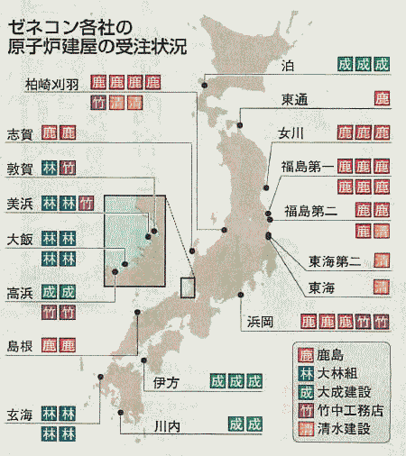 ●除染は移染そして利権 一方、東京新聞の2011年12月8日朝刊は、「造ることで稼ぎ、壊れても稼ぐ… 大手ゼネコンが握る「除染利権」」という大きな見出しで、除染業務は独立行政法人・日本原子力研究開発機構(原子力機構)が元請けとなり、大手ゼネコンによる3つの共同企業体(JV)に下請けされると報じた。 同紙はさらに、受注するJVは、もともと原発建設の受注でトップスリーを占める大手ゼネコンであることも明らかにしたのである。 下図は、東京新聞に掲載された「ゼネコン各社の原子炉建屋の受注状況」である。簡単に言えば、原子炉の建屋の建設を受注したゼネコンの勢力図である。図からは、 原発建屋のうち福島第一原発及び福島第二原発は鹿島建設がすべて受注していることが分かる。 ![]() 出典:東京新聞の2011年12月8日は、「造ることで稼ぎ、壊れても稼ぐ… 大手ゼネコンが握る「除染利権」」 以下は東京新聞記事のリード部分である。