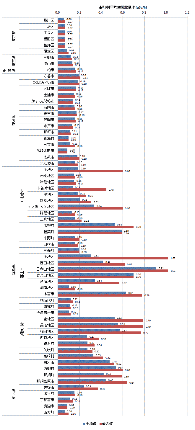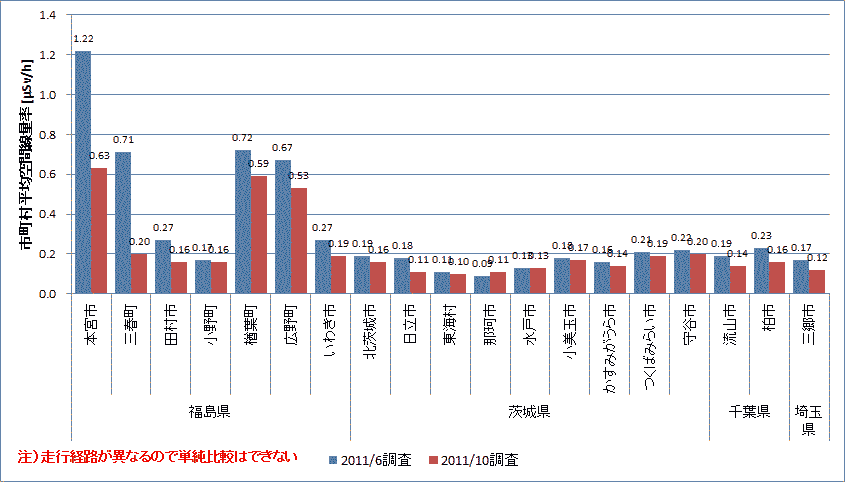 今回は、2011年10月16日、早朝、午前4時に東京都品川区の青山自宅に集合、おおよそ640kmを一日で走破し、膨大な量の放射線量を測定した。 以下は今回の全走行ルートである。 東京都品川区の青山自宅→荏原入口から首都高→足立区加平→埼玉県三郷料金所→常磐自動車道→いわき湯本ICで下車→いわきの海岸部(小名浜港、中之作港、江名港、江名走出、豊間海岸、薄磯海岸、新舞子海岸、久ノ浜、四倉海岸、広野など)→いわき市市街地→食事→広田法律事務所(広田弁護士の事務所で広田弁護士、坂本弁護士、櫻井南相馬市長らと会う)→いわき中心市街→磐越高速道→小野町→船引三春→郡山東→猪苗代→常磐河東で高速下車→一般道で会津若松市→郡山市→須賀川市→東北道に入る→浦和料金所→首都高速道路→荏原出口→青山自宅 走行距離概要 東京→広野+いわき市内 240km いわき市→会津若松 140km 会津若松→東京 260km 天候は午前中雨、午後は浜通りは曇り、中通りは晴れ、会津若松は曇りだった。 以下は、今回の福島県内放射線量測定調査時の自動車走行ルート図である。 ![]() 今回の福島県内放射線量測定調査時の自動車走行ルート ![]() 今回の福島県内放射線量測定調査時の自動車走行ルート 会津若松地区 ◆調査の方法 なお、調査の方法は、自動車の走行ルートをGPSで計測、記録するとともに、携帯型放射線量計で原則地上1m高のガンマ線(マイクロシーベルト/時)を測定し、両者を時刻で照合し合う方法である地点の放射線量の値を記録している。 結果では、同一市町村あるいは地区に複数の調査地点が含まれており、それらの平均値および区間内最高値を示す方法をとっている。 ◆調査の結果 以下は調査結果である。今回の測定の大部分は自動車による移動測定であるが、主要地点では固定測定(地上1m高さ、さらに地表面)も行っている。 図中、青は平均値、赤色は測定区間内の最高値である。福島県内に関しては、今回初めて会津若松地区内の放射線量を調査した。同地区の空間放射線量は0.10〜0.14μSvの範囲にあり、東京都内の放射線量の約2倍のレベルであった。 |