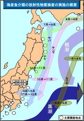 今朝(2月13日)で、公表後6日目で7000を超えるアクセスを記録しています。多くの方々が見られたことで、視聴者からの情報提供も相次ぎ、いろいろ新事実も分かってきました。 ◆青山貞一「福島原発事故で、本当に恐ろしいのは魚介汚染」 http://www.youtube.com/watch?feature=player_embedded&v=ALvIdgc824Q#! とくに重要と思えるのは、国が公表している魚介類に含まれる放射能データですが、どうも国などは多くの魚を採取し、計りながら、低い値だけを選択して公表している可能性が大であることです。 これについては国会議員の協力を得ながら、国に情報開示請求をしつつ真相を確かめます。 ●底生魚の汚染 動画でも伝えましたが、昨年秋以降は、海底近くに棲むアイナメ、ヒラメ、ホウボウ、メバル、カレイ、アンコウ、タチウオなどの底生魚の濃度が高くなっているはずです。事実、最近1800Br/kgを超える底生魚が福島県北部から報告されています(これは新聞などにはでていません)。 鷹取敦さんの調査では、魚介汚染が深刻化する昨年秋以降、国の魚介調査の件数は減少しているとのことです。今年に入ってからの測定数は極端に少なくなっています(以下参照のこと)。 ◆鷹取敦:水産物の放射能汚染の解析(1)生息域と汚染の変化 http://eritokyo.jp/independent/takatori-fnp0008.htm 高い値の底生魚が発見されても、国、県、漁協はいずれもその対策にまともに応えず、たらい回しし、マスコミも一切書かず、うやむやのうちに、産地偽装で食卓に高濃度魚介が到着している可能性があります。 底生魚の濃度が今後高くなることは、先のNHKの特別番組の調査でも明らかになったことです。 ●今後の予想(海流などとの関連) ところで福島県沖の海域は、親潮、黒潮、潮流が複雑に混ざりあいます。以下の図は、親潮と黒潮が混ざり合い向かう方向を示した概要図です。北からの親潮と南からの黒潮が福島県沖で混ざり合うことが分かります。 ![]() 日本近海における親潮(緑)と黒潮(赤)の概略図 出典:Wikipedia 下は水産庁の海産魚境類の放射性物質検査の実施の概要にある海流の図である。 ![]() 出典:水産庁 当然のこととして、汚染は潮流や海流によって移流し拡散します。 そのため、動画にも掲載しました以下のフランス、米国の研究機関による海洋汚染シミュレーションにも明確にあるように、近海魚、沿岸魚、底生魚だけでなく、かなり沖合にも汚染が広がる可能性が大です。以下では汚染の程度を色で示しています。紫→赤→黄→白と濃度が下がってゆくことになります。 以下は、フランスの Institut de Radioprotection et de Surete Nucleaire及び米国のNOAA(米国国家海洋気象局)、US Navey(米国海軍)、GEBCOが行った福島第一原発による海洋汚染のシミュレーションの一部。 ![]() 福島第一原発事故による海洋汚染予測(海洋汚染系) 出典: Institut de Radioprotection et de Surete Nucleaire(France) ![]() 福島第一原発事故による海洋汚染予測(海洋汚染系) 出典: NOAA(米国国家海洋気象局)、US Navey(米国海軍)、GEBCO 汚染がさらに太平洋全体に広域化したりベーリング海に拡大すれば、国際問題にも発展することは想像に難くありません。 チェルノブイリ事故時でさえ、日本近海で2,3年汚染が続いたことからして、今後10年以上、海洋汚染が続き、太平洋側の魚介の汚染は継続する可能性があります。その意味でも、水産庁などがしっかり定期的かつ大規模に定点近くで試料採取した魚類を測定分析し、すべてを公表する必要があります。 期待はできませんが、政府に提案したいと思います。 とりいそぎ |