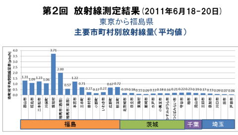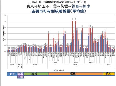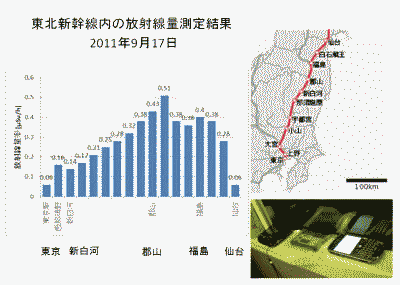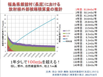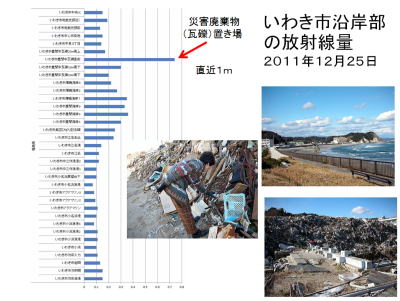 F6回にわたる現地放射線量測定結果、 G福島県内主要地点での積算線量と将来線量推計、 H放射性物質に汚染されたがれきからの線量と放射能 (ベクレル/kg) 私たちは2011年4月上旬から12月下旬まで6回にわたり福島県内を中心に各地域の放射線量を固定及び車を使った移動で測定しました。それらの測定結果はすべて独立系メディア E-wave Tokyoのホームページに掲載するとともに、一部は環境アセスメント学会などの学会誌などにも掲載しました。 ![]() 出典:青山貞一 ひとつの大きな問題は、2011年春当時、国、自治体などの放射線量は地上高の説明なしに発表されましたが、地上1m(これが基本)とたとえば地上すれすれ(私たちは5cmで測定)では、実測値で最大10倍も放射線量が異なっていたはずです。 子供や幼児は泥遊びが好きなこと、身長が低いことなどを考慮すると、当初から地上1mとともに、地表で測定しデータを公表すべきであったと考えます。 ![]() 出典:青山貞一 以下は、東京→埼玉県→千葉県→茨城県→福島県→栃木県→埼玉県→東京都を走行する自動車に設置したGPSに連動して放射線を測定した結果を自治体別に平均化し示したものである。 ![]() 出典:青山貞一 私たちは2011年春の時点で携帯タイプの放射線量計とGPS(グローバル位置表示システム)を連動させ、自動車内で放射線量を計測可能なシステムを開発しました。 これにより車で地域を走行すればするほどデータが取得できることになり、大幅に測定データ取得が容易となりました。 ![]() 出典:青山貞一 ![]() 出典:青山貞一 以下は、ほぼ同一ルートで2011年10月と12月に測定した放射線データを比較したものです。12月が若干低くなっているが、測定そのものの精度が保たれていることが分かりました。 ![]() 第4次福島空間放射線量現地調査ルート(概要) 市町村別平均値 単位:μSv/h前回調査(第4次) 期日:2011年10月16日 今回調査(第5次) 期日:2011年12月25日〜27日 ◆青山貞一・鷹取敦・池田こみち:福島原発事故に起因する放射性物質による地域汚染の実態解明と汚染構造の把握(速報),環境アセスメント学会誌、2011年 Vol.9 No.2 出典:青山貞一 ![]() 出典:青山貞一 以下は福島県いわき市浜通にある薄磯海岸における放射性物質に汚染された災害廃棄物からの放射線量測定調査の写真です。 ![]() いわき市薄磯海岸の瓦礫の約1m前で放射線量を計測する鷹取敦 撮影 青山貞一 2011.10.16 ![]() いわき市薄磯海岸の瓦礫の約1m前で放射線量を計測する鷹取敦 撮影 青山貞一 2011.10.16 ![]() 豊間中学校のプールにも災害廃棄物がうずたかく積まれていた。 飛び込み台が見える 撮影:青山貞一 Nikon CoolPix S8 2011.12.25 ![]() 災害瓦礫の直近で放射線量を測定する池田こみち 撮影:青山貞一 Nikon CoolPix S8 2011.12.25 ![]() 図 福島県いわき市内 空間放射線量測定値 単位:μSv/h 測定期日:2011年12月25日 午前 天候:晴れ 参考 ◆青山貞一:がれきに含まれる放射性物質量と放射線量の関係について ![]() 出典:青山貞一 ![]() 出典:青山貞一 以下は、福島大学金川キャンパスにおける積算線量のシミュレーション結果です。福島市では、見て分かるように2011年3月15日から1ヶ月の間に相当量の被曝が起きていることが分かります。 ![]() 出典:青山貞一 上記をふまえた各地域の汚染の実態、国、県などの測定の課題、過去から現在さらに将来にわたる積算放射線量のシミュレーション ◆青山・池田・鷹取:福島県飯舘村における放射線外部被ばく積算量の推計 ◆青山・池田・鷹取:福島大学キャンパスにおける放射線外部被ばく積算量の推計 ◆青山・池田・鷹取:東京都新宿における放射線外部被ばく積算量の推計 上記のエッセンスは、環境アセスメント学会の学会誌の次号(2012年2月)に論文掲載されますが、上記のシミュレーションと各種データの詳細解析により、3月12日から3月22日までの間の各地の汚染がどう進行したかがほぼ分かりました。これは、皆さんがよくご覧になる政府や米国DOEなどによる各地の放射性物質汚染地図と符号しています。 被害推定では、福島県内主要地点における実測値をもとに各核種の半減期をもとに将来シミュレーションを行った結果を提示しました。いつ当該地域の積算放射線量が20mSv,100mSvとなるかなどです。ただし、これは外部被曝だけの推計なので、これに水、各種の食べ物がオンされます。 汚染された災害がれきの処理についても、この間、環境総合研究所が現地でがれきからの放射線量を実測した内容をふまえ提案してきました内容を説明しました。 環境省が非公開検討会で決めた広域処理、それも燃やして埋める方式の処理がいかに原理的に間違っているか、間違った案を市町村に押しつけ、各地の市民団体などの反対を受けているかについても実例をあげてお話ししました。 参考 ◆青山貞一・池田こみち:原理的に間違っている国の汚染瓦礫処理 つづく |