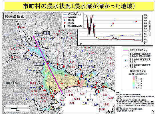 以下は陸前高田市の浸水被害の実態である。図より分かるように陸前高田市では、市域の相当奥深くまで浸水していることが分かる。