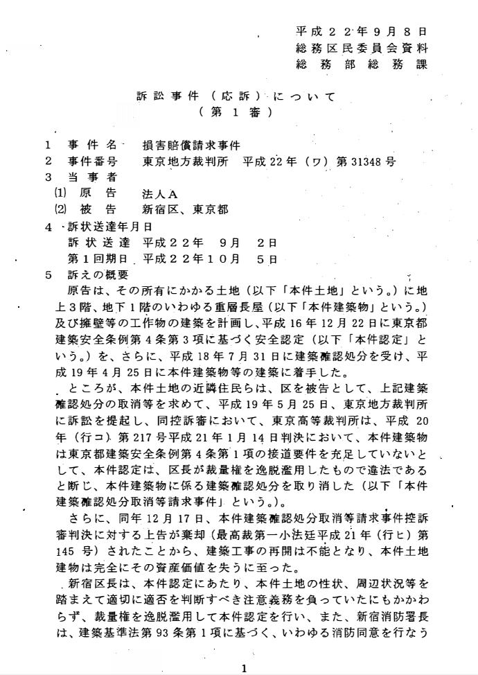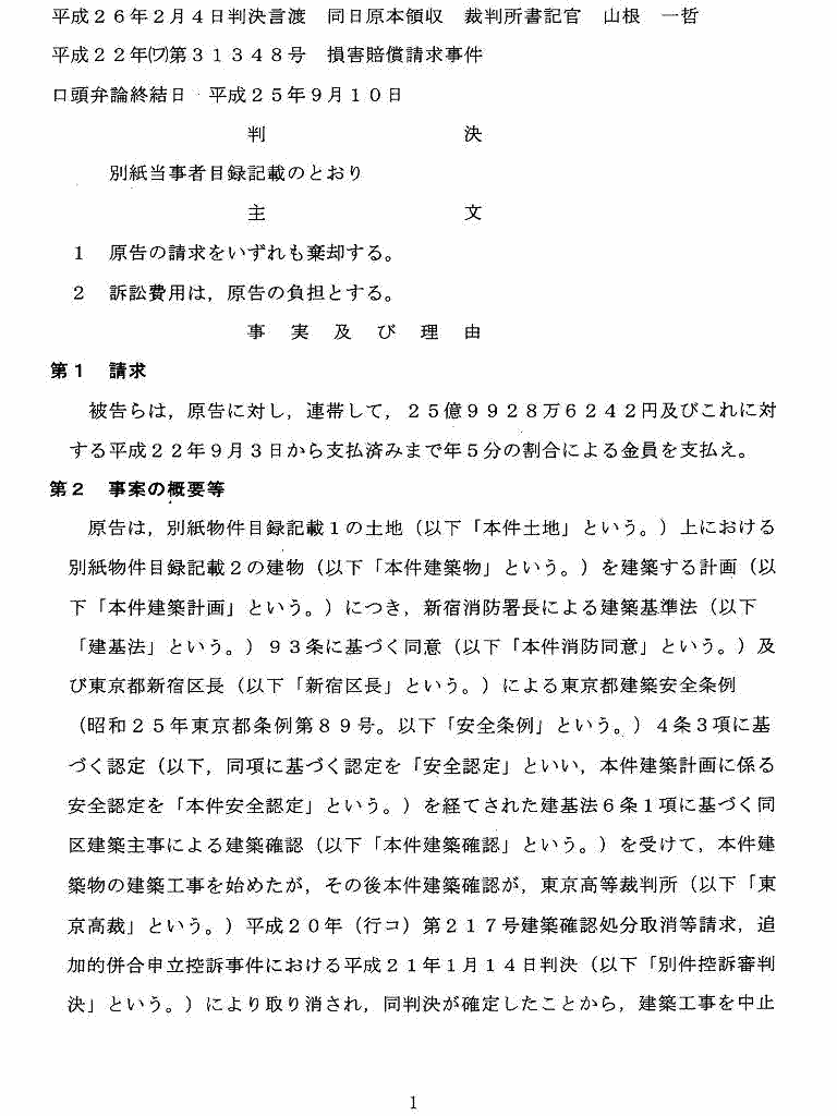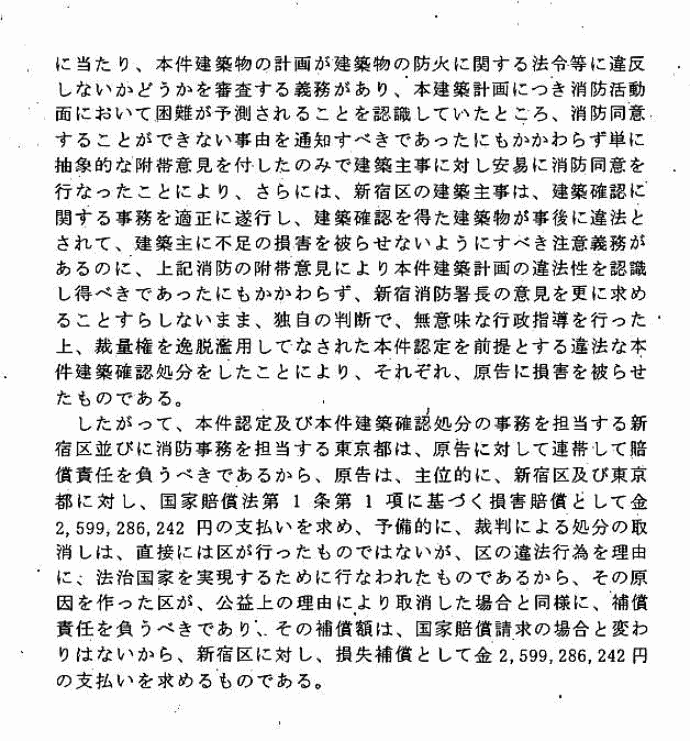 | 1 2 3 4 5 6 7 8 9 10 ◆マンション業者が新宿区に対し起こした損害賠償請求事件 以下は、マンション業者(新日本建設)が新宿区に対し起こした損害賠償請求事件の東京地裁判決の冒頭部分と争点部分です。マンション業者(新日本建設)の請求はいずれも棄却されていることが分かります。 業者は建築確認を下した東京都新宿区を損害賠償で提訴していますが、本来、このような案件に対し条例などを援用し無理矢理建築確認を下した東京意図新宿区の責任は免れないはずです。 ![]() 出典:東京地方裁判所 平成22年(ワ)第31348号 損害賠償請求事件 判決書 以下は、主要な争点です。 5 争点(5) (原告の損失補償請求が認められるか)について (1) 原告は,本件安全認定の違法を理由として本件建築確認が取り消されたことにより,本件安全認定や本件建築確認の有効性を信頼した原告の本件建築物に係る財産的価値が失われたのであるから,特別の犠牲を課された原告には信頼保護原理から派生する財産保護のために憲法29条3項に基づき損失補償請求権が認められるべきであると主張する。 (2) そこで検討するに,まず,建基法43条を受けて定められた安全条例4条所定の接道義務の趣旨は,平常時における円滑な通行や災害時における避難,消火及び救助活動のための通路の確保を図りもって国民の生命,健康及び財産の保護を図る(同法1条)ことにあると解されることからすれば,建基法等が定める接道義務による制約は公共の安全を図るための内在的なものであり,これを本件訴訟に即していえば,原告には,そもそも本件土地につき安全条例4条1項所定の接道義務が充足されるのと同等の安全性を備えた建築計画に沿った土地利用しか許されないとの内在的制約が課されていたというべきである。そうすると,本件安全認定等によって本件建築計画に沿った建築工事を続行できなくなったことも当該内在的制約が顕在化したものにすぎないと解することができる。 (3) また,我が国においては,取消訴訟等の抗告訴訟や審査請求等の手続により行政処分の効力を争えることとされており,本件安全認定や本件建築確認のような受益的行政処分についても,当該処分の名宛人以外の取消しを求めるにつき法律上の利益を有する者が取消訴訟等によって当該処分の有効性を争うことができる(行政事件訴訟法9条)のである。そして,その帰趨によっては当該処分が取り消される可能性もあるのであるから,当該名宛人は,利害関係人として当該取消訴訟に参加し,当該処分が維持されるよう必要な訴訟活動をすることも可能である。そして, 当該名宛人が, 当該処分の有効性を前提に行動し, その後取消訴訟等によって当該処分が無効とされたことで何らかの不利益を被ったとしても,そのような不利益は,基本的には,我が国が上記のとおり抗告訴訟等の手続により行政処分の効力を争い得ることとしたことに必然的に伴うものであり広く国民が甘受すべき一般的な犠牲にすぎないとも解し得るところである。 (4) さらに,本件については次の事情を指摘することができる。すなわち,本件安全認定がされることを停止条件として本件土地を購入するなど原告が本件安全認定の有効性を前提に行動していたことは確かであるが,本件安全認定がされてから2か月も経たない平成17年1月12日にはD管理組合から第一次審査請求がされていたのであり,原告やソフトアイとしても同年4月26日に説明会を実施した際に,周辺住民らから本件建築計画の安全性について疑義が呈されるなどして本件土地に本件建築物を建築することに対する強い反対意見が述べられたのを受けて,最終的に本件安全認定の有効性がどうなるのか分からないが最終的な判断には従わざるを得ないなどと述べていた(乙10)ように,比較的早期の時点から,本件安全認定が取り消されるおそれを抽象的にせよ認識していたのである。また,原告及びソフトアイは,平成19年4月17日に説明会を実施した際にも,周辺住民らに対して同月25日から建築工事に着工する旨説明するとともに,第一次審査請求に係る訴訟や第二次審査請求に関して「負ければそこでいったんストップしてやり直しです。私も申し訳ないですけど,私どもが勝てば,今着手したものがむだにならない。でも負ければむだになるかもしれません。むだを覚悟でやっている。」,「リスクを負ってでももうやりましようというのが金綱社長(注:原告代表者)の考えでもあるわけです。」などと審査請求等の結果で建築工事が続行不可能となったとしてもその不利益は建築主において甘受するものと認識していたことがうかがわれる(乙15)。そして,以上で指摘した点からすれば,原告は,幾度にもわたる説明会や本件安全認定等の有効性を巡る審査請求や訴訟を通じて,本件安全認定等の問題点を認識し,同日に建築工事に着工した時点において本件安全認定等に違法がある可能性を理解していたものと推認されるのである。 (5) 以上のとおり,本件建築物の建築工事が続行不可能となったことは内在的制約