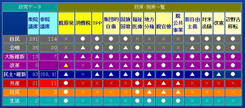 ●は賛成、×は反対、▲は不明(是々非々とされているか、党内で分裂している、あるいは判断情報不足)