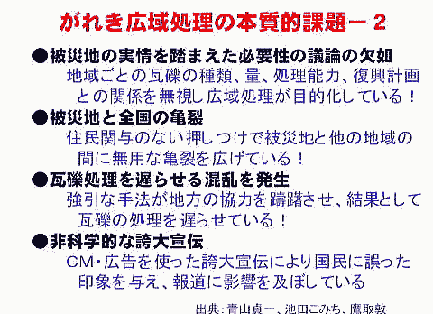 以下は、2013年8月25日、北九州市で青山貞一ががれき広域処理問題に関連し講演した際に用いたパワーポイントのうち、がれき広域処理の本質的課題をまとめたものです。